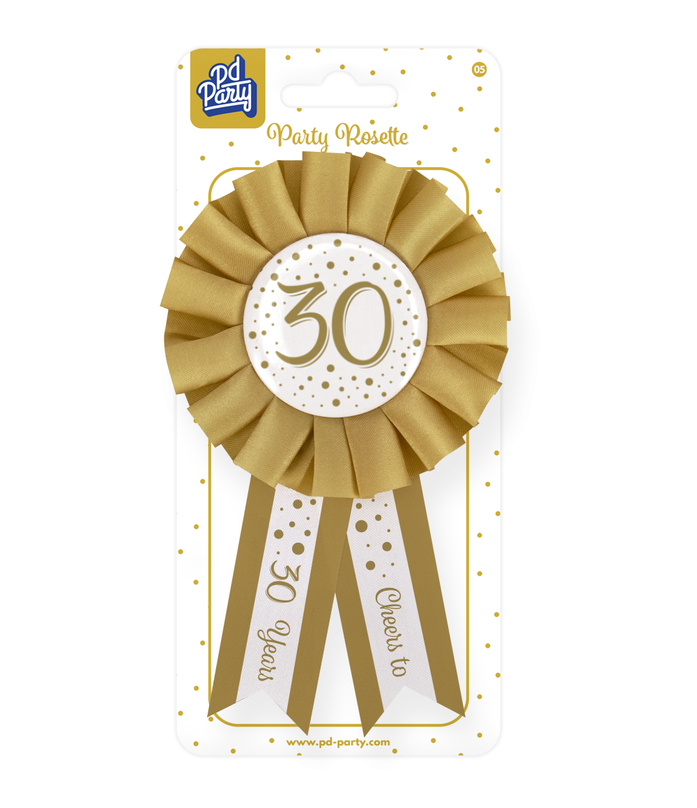 Deze party roset is erg leuk om te dragen bij een verjaardag of andere leuke gelegenheid. Door het gold/white design valt hij extra goed op!