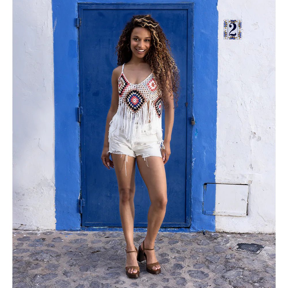 De vrolijke ruitpatronen in retrokleuren geven deze gehaakte top een speelse boho-look, perfect voor zonnige dagen, zomerse feestjes en festivals. Het luchtige materiaal, de comfortabele pasvorm en de zwierige franjes maken deze crop top in maat M een must-have item voor elke partygarderobe.