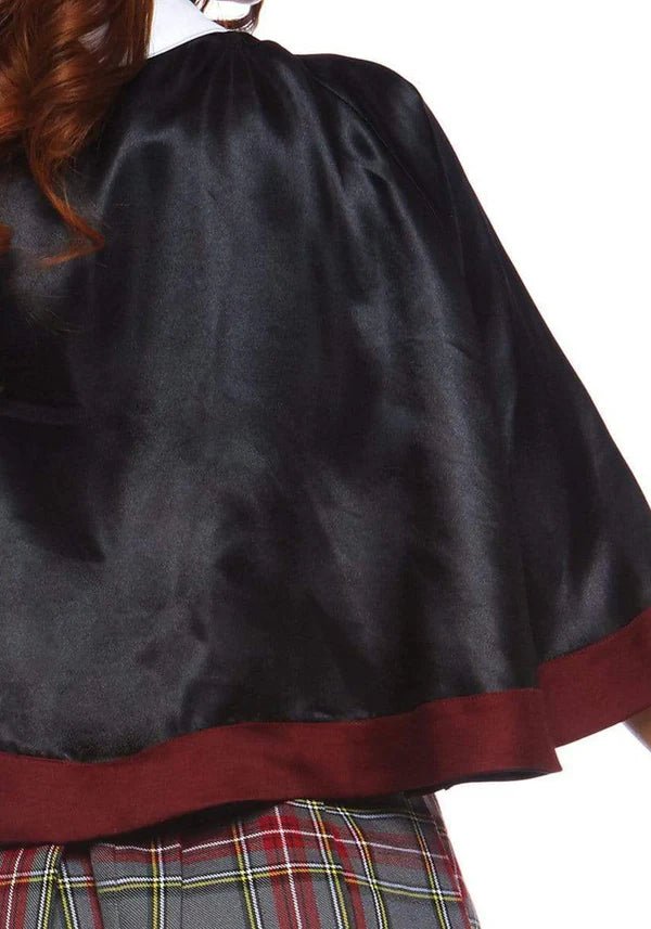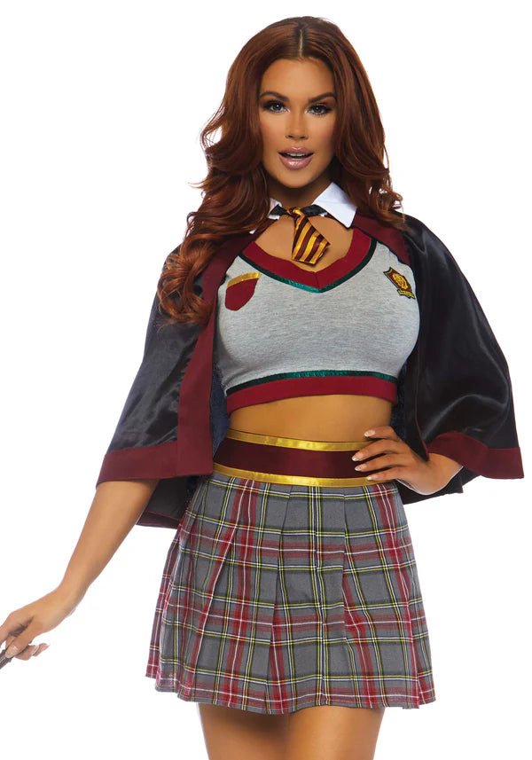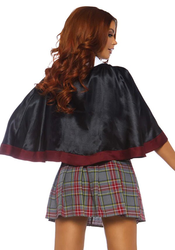 Laat je toverkunsten zien in de 3-delige Spellbinding School Girl set van Leg Avenue! Deze betoverende outfit bevat een crop top met badge accenten, een hoog getailleerde geruite rok en een cape met aangehechte stropdas. Perfect voor Halloween, themafeestjes of een magische cosplay look! 🖤📚