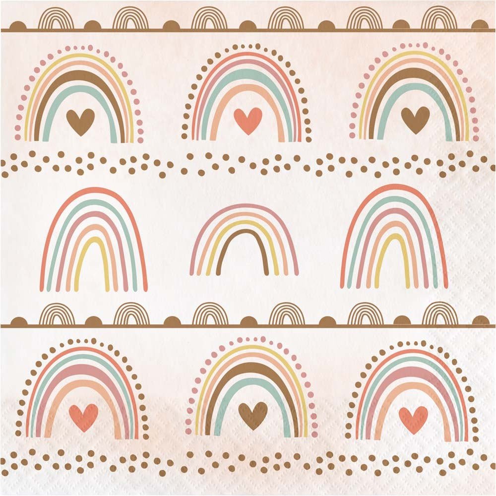 Fleur je feesttafel op met deze Boho Rainbow Lunch Servetten. Versierd met een zich herhalend regenboogpatroon en subtiele metallic koperinkt, zijn deze vrolijke servetten ideaal voor een eerste verjaardagsfeestje of babyshower.