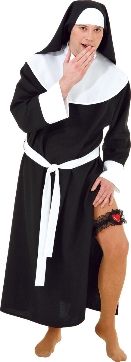 Dit sexy nonnenkostuum voor heren bestaat uit een jurk met kap en riem. Een compleet verkleed- of themakostuum. Gemaakt van 100% polyester geweven stof.