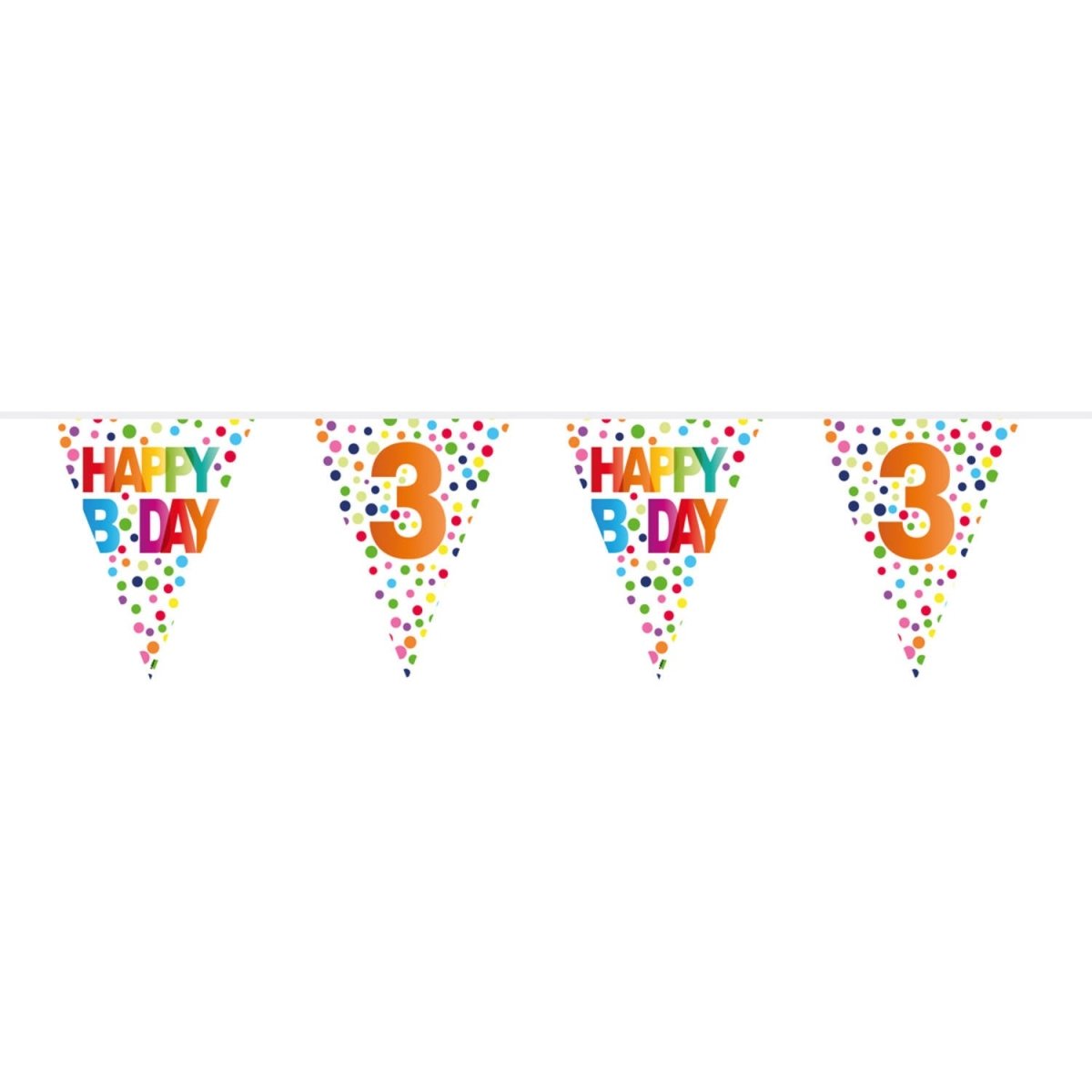 3 Jaar Happy Bday Dots Vlaggenlijn - 10 meter. Inhoud: 1 vlaggenlijn. Kleur: Meerkleurig. Bijvoorbeeld te gebruiken tijdens de volgende feestgelegenheid/feestgelegenheden: Verjaardag, Kinderfeestje en Jubileum. Deze vlaggenlijn is 10 meter lang. Het artikel is gemaakt van plastic.