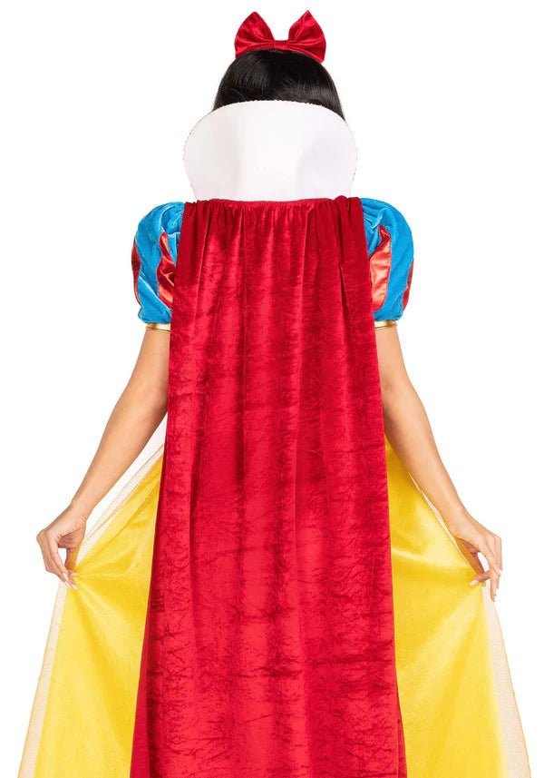 Beleef de magie van sprookjes met dit betoverende 3-delige Deluxe Snow White kostuum! Dit elegante ensemble bestaat uit een klassieke fluwelen en satijnen baljurk, verfraaid met gevlochten gouden biezen en een majestueuze opstaande kraag. De afneembare fluwelen cape voegt een koninklijk accent toe, terwijl de schattige strikhoofdband jouw prinsessenlook compleet maakt. Perfect voor verkleedfeesten, sprookjesthema's of het herbeleven van je favoriete verhaal! 🌟💖