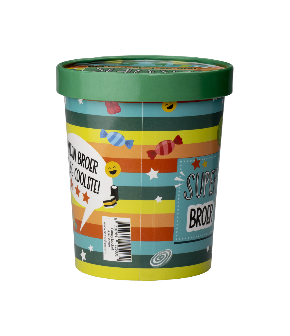 De vrolijke candy buckets zijn een echte eyecatcher in de winkel. Mede door het leuke design is deze candy bucket erg leuk om te krijgen. De snoepemmers zijn gemaakt van karton!