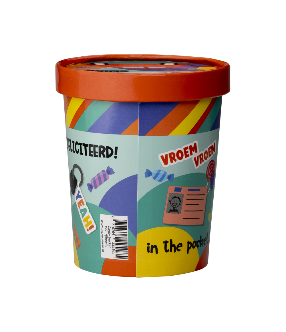 De vrolijke candy buckets zijn een echte eyecatcher in de winkel. Mede door het leuke design is deze candy bucket erg leuk om te krijgen. De snoepemmers zijn gemaakt van karton!