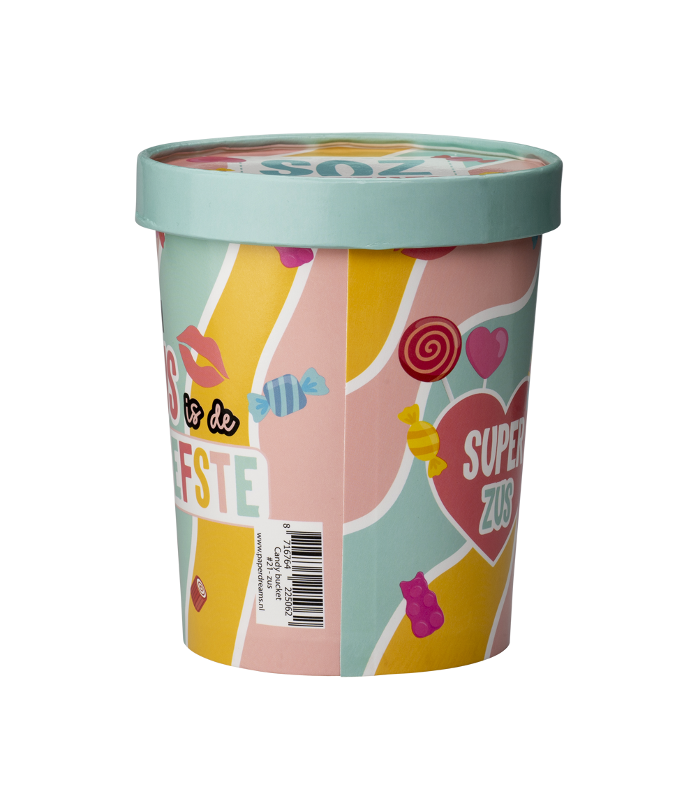 De vrolijke candy buckets zijn een echte eyecatcher in de winkel. Mede door het leuke design is deze candy bucket erg leuk om te krijgen. De snoepemmers zijn gemaakt van karton!