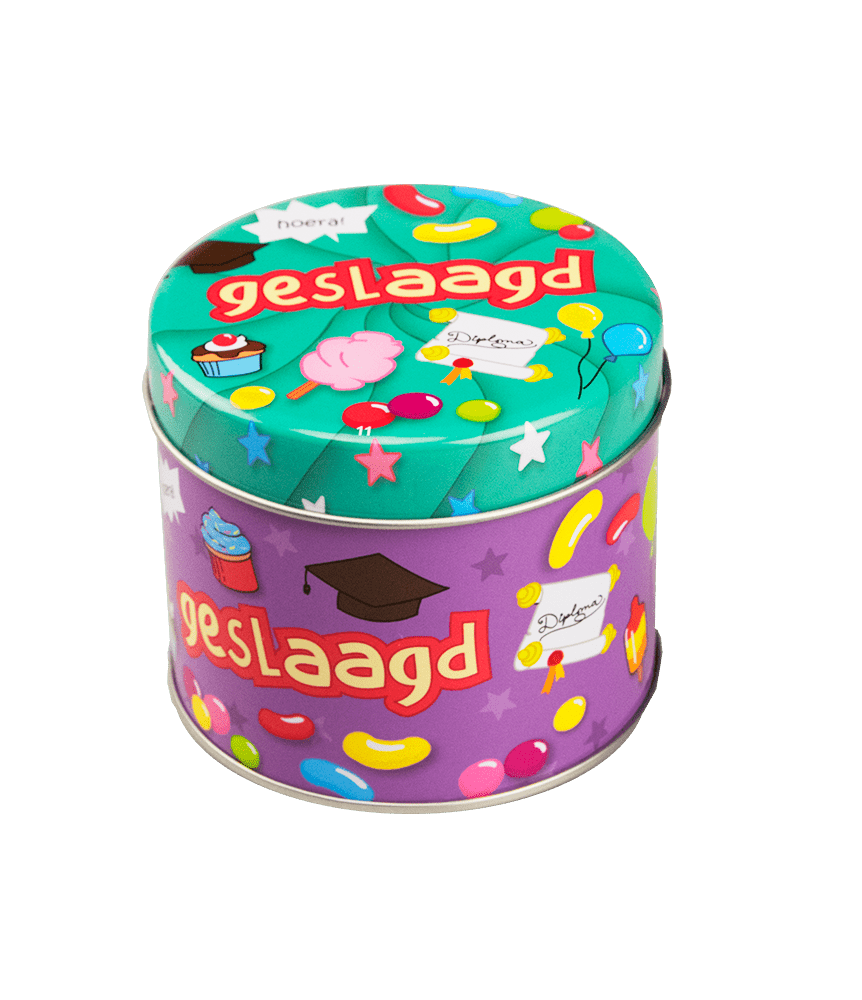 Verpakkingsinhoud: Snoepblik Geslaagd School 9cm