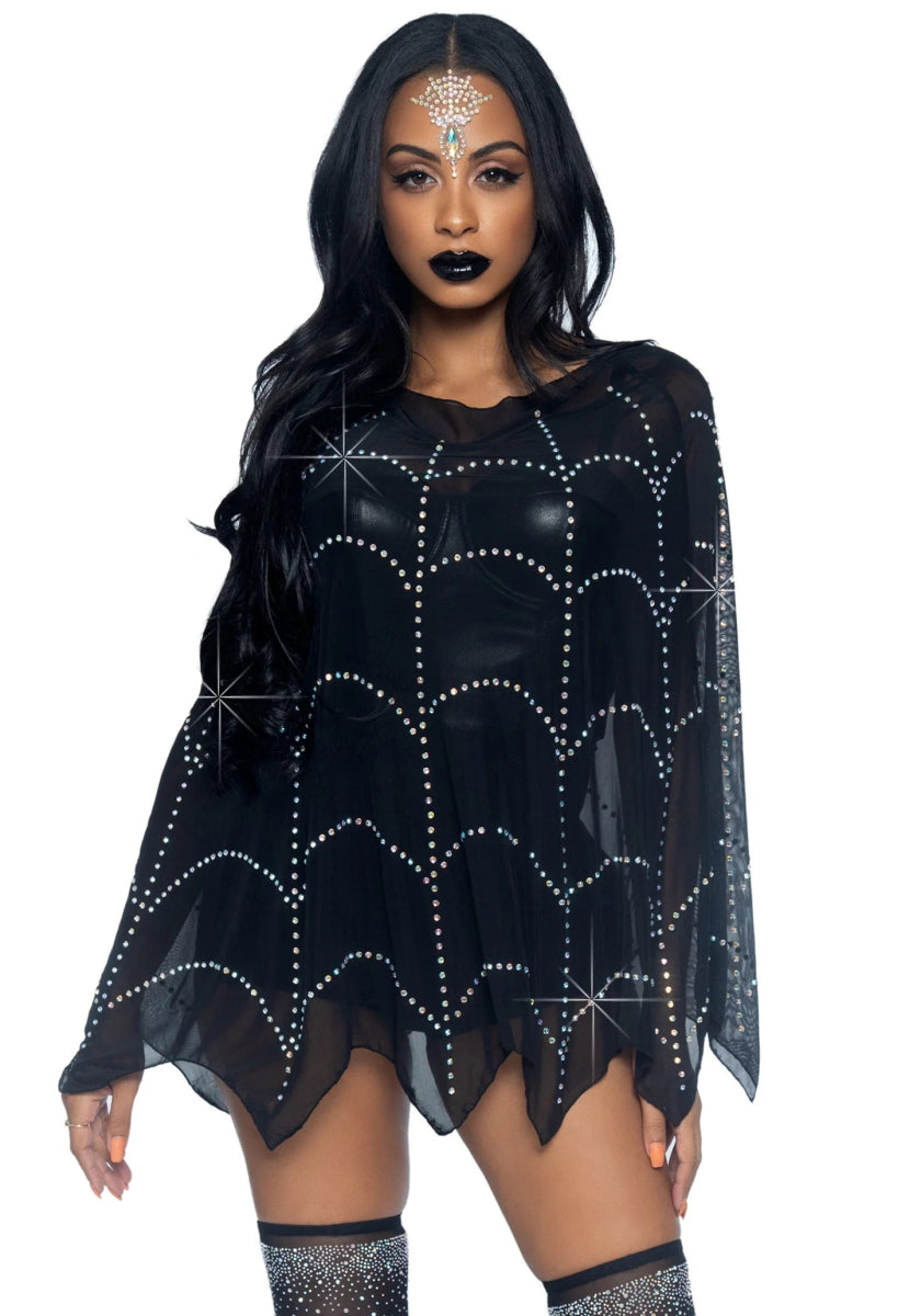 Duister, mysterieus en sprankelend – met deze Spooky Spiderweb poncho ben jij klaar om Halloween stijlvol te vieren! Dit eenvoudig te dragen en flatterende poncho-kostuum is versierd met een fonkelend spinnenweb van strass en een sierlijk geschulpte rand. Perfect voor een snelle, maar magische Halloween-look! 🖤🕷️