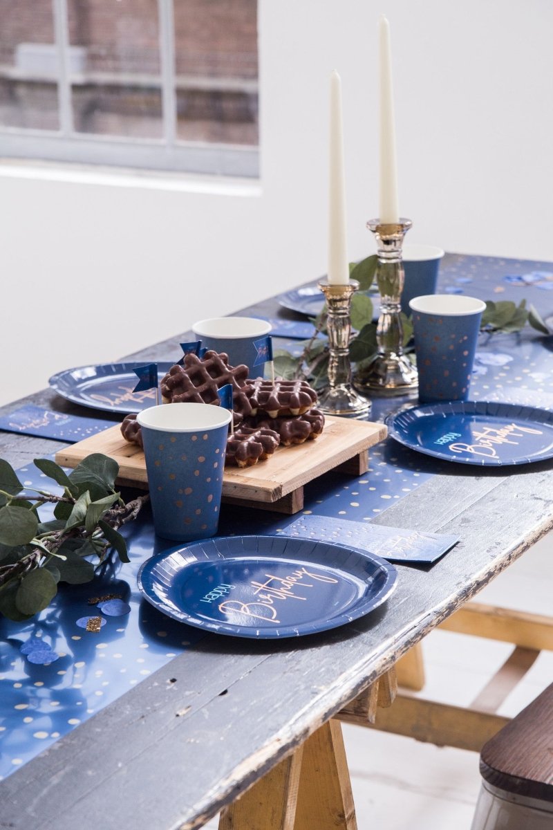 Tafelloper Elegant True Blue - 240x40cm. Inhoud: 1 tafelloper. Kleur: Blauw. Bijvoorbeeld te gebruiken tijdens de volgende feestgelegenheid/feestgelegenheden: Verjaardag, Kinderfeestje en Jubileum. Afmetingen van dit artikel: 240 x 40 cm. Het artikel is gemaakt van papier.