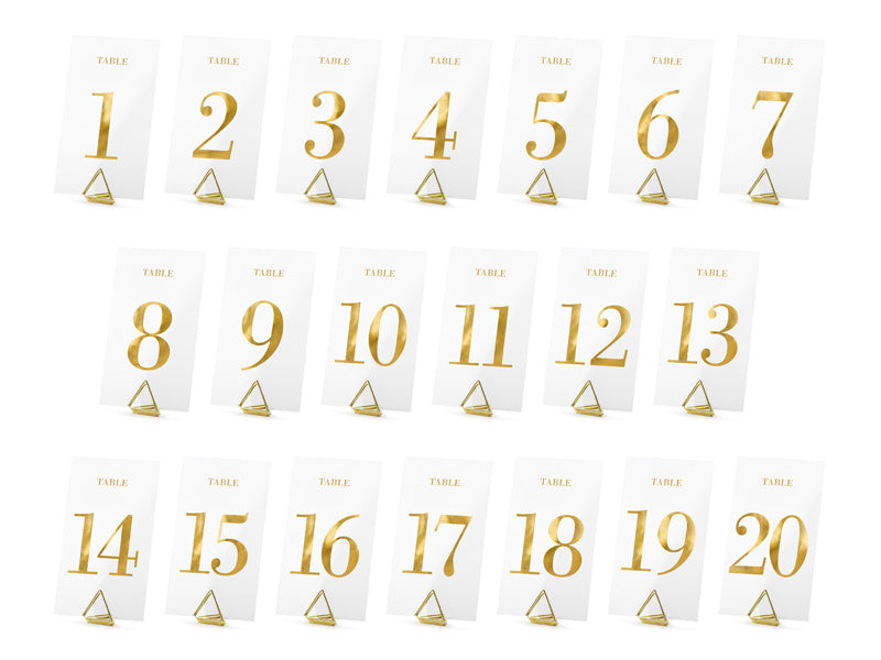 Tafelnummers gemaakt van transparante folie met metallic gouden nummerprint, set bevat nummers van 1 tot 20, formaat ca. 7 x 12 cm.