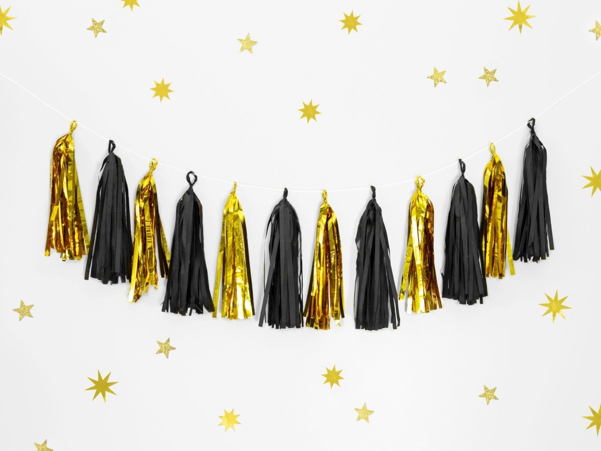 Inhoud: Tassel slinger, doe het zelf, set bevat 12 kwasten (mirror goud, zwart, 6 stuks per stuk) en ca. 2 m van de witte touw, maten na het monteren: hoogte ca. 30 cm, lengte ca. 1,5 m.