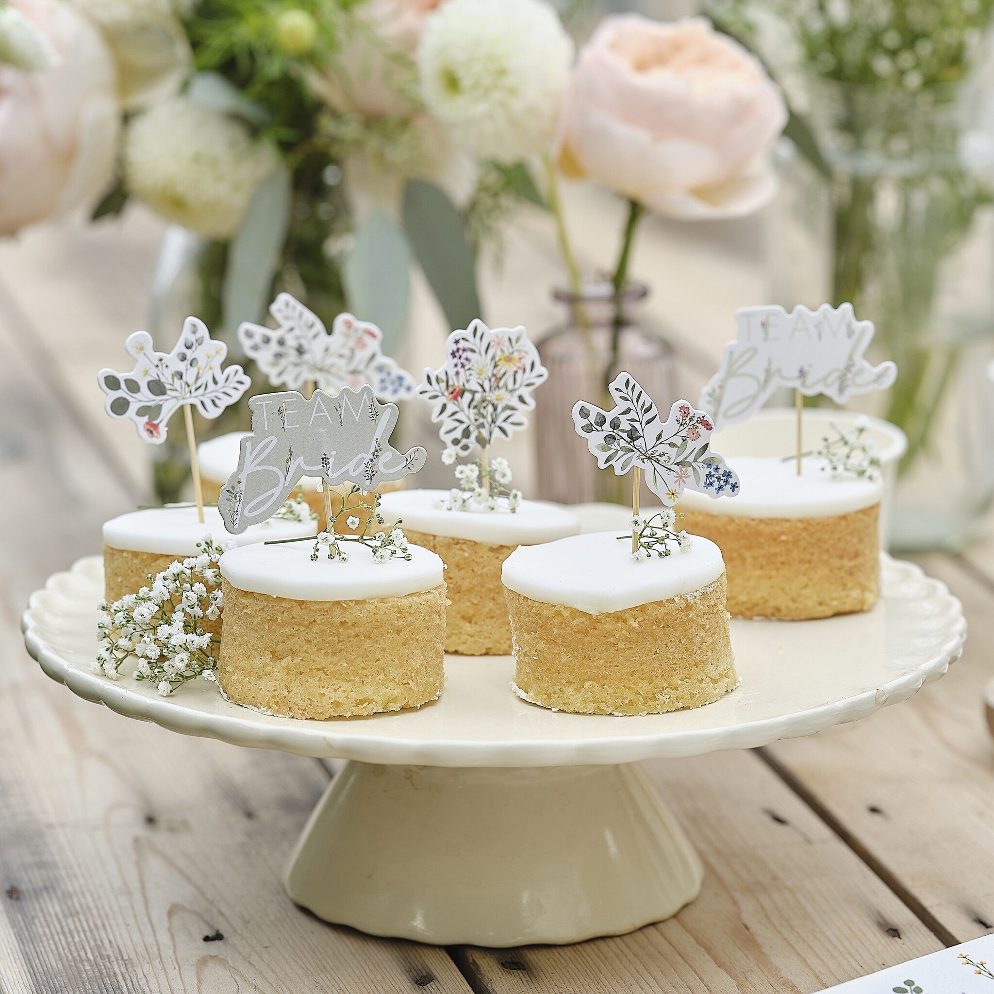 Elke verpakking bevat 12 papieren vrijgezellenfeest cupcake toppers, waarvan 6 'Team Bride' en 6 bloemen toppers.