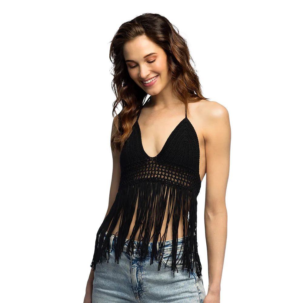 Laat de zon maar schijnen met deze leuke zwarte gehaakte top in maat M! Het sierlijke patroon in het midden en de speelse franjes aan de onderzijde geven de crop top een echte boho-uitstraling. Perfect als eyecatcher voor festivals, strandfeestjes of een zonnige dag in de stad.