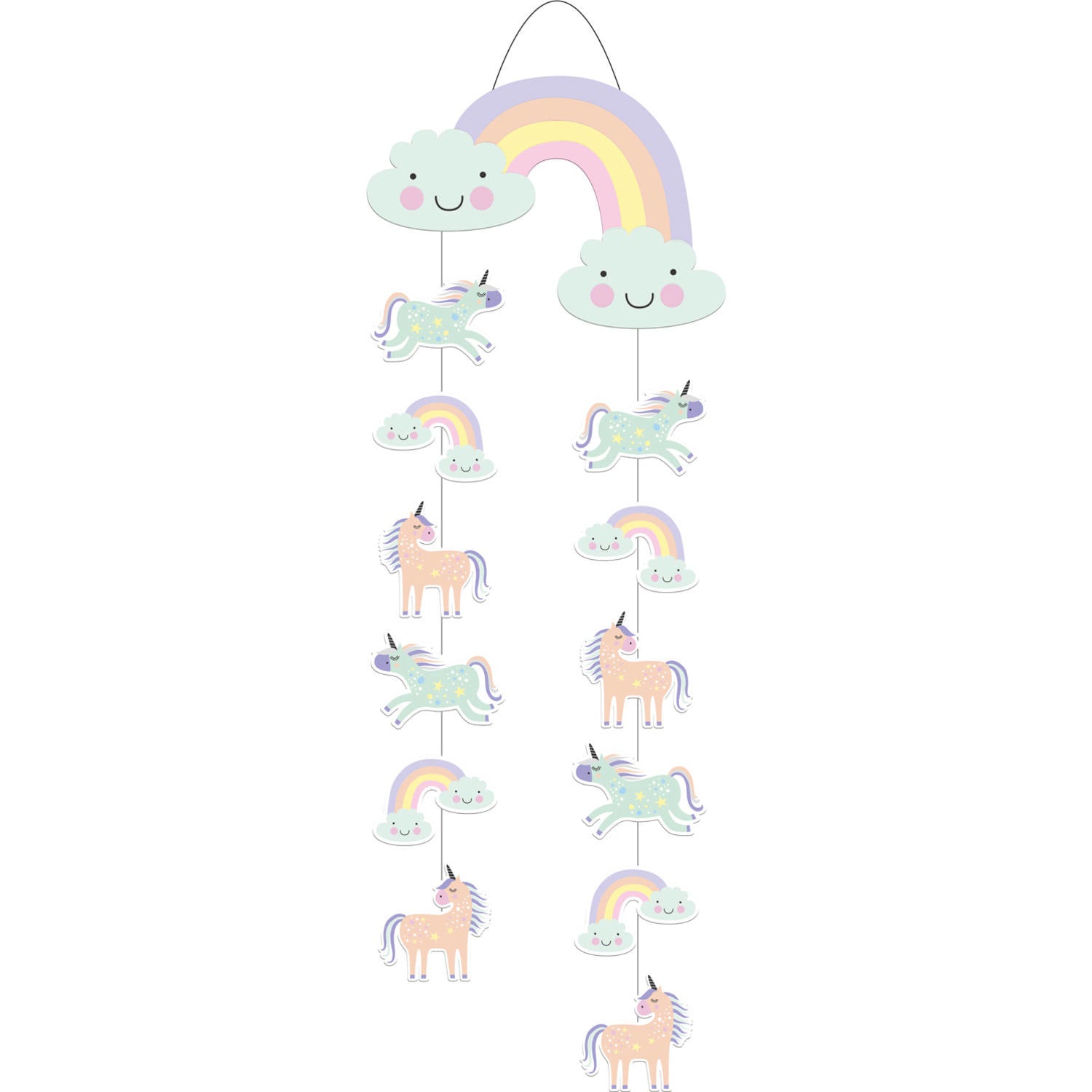 Hangdecoratie Unicorns & Rainbows - 30x85 cm. Inhoud: 1 stuk hangdecoratie. Kleur: Meerkleurig. Bijvoorbeeld te gebruiken tijdens de volgende feestgelegenheid/feestgelegenheden: Kinderfeestje. Het artikel is ongeveer 30x85cm en is dubbelzijdig bedrukt. Het artikel is gemaakt van papier.