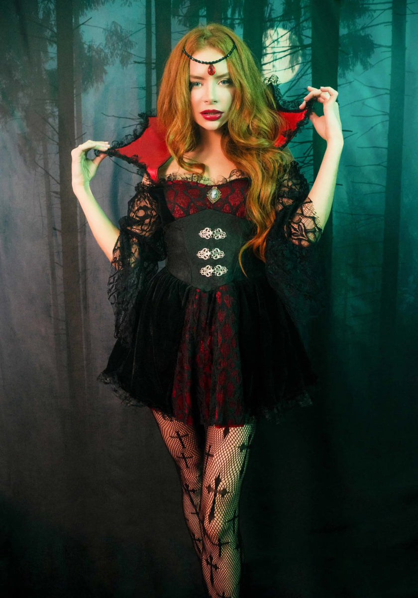 Jouw hypnotiserende uitstraling maakt elke prooi weerloos, waardoor jouw dodelijke kus onweerstaanbaar wordt. Dit betoverende 2-delige Leg Avenue kostuum bestaat uit een donkere, sexy kanten jurk met dramatische klokmouwen, een taille-cincher met gespsluiting en een sierlijke cameo. De geschulpte opstaande kraag en het met juwelen versierde hoofdsieraad geven jouw vampierlook een koninklijke touch. 🩸✨