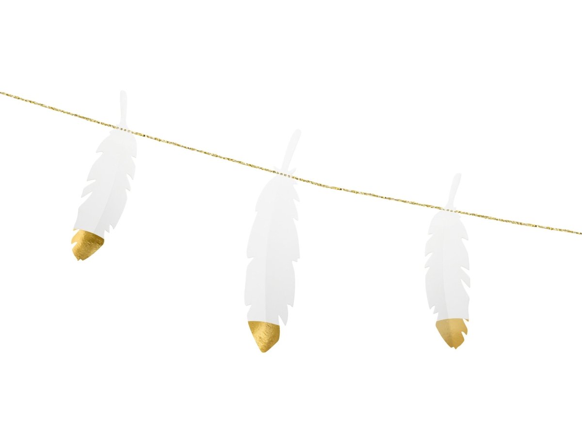 Inhoud: Genaaid slinger Veren, wit met gouden metallic uiteinden, afmeting: hoogte ca. 13,5 cm, lengte ong. 1,6 m.