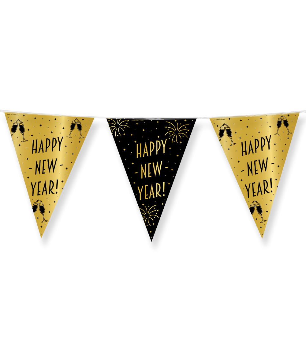 Vlaggenlijn Happy New Year Goud Zwart 10m