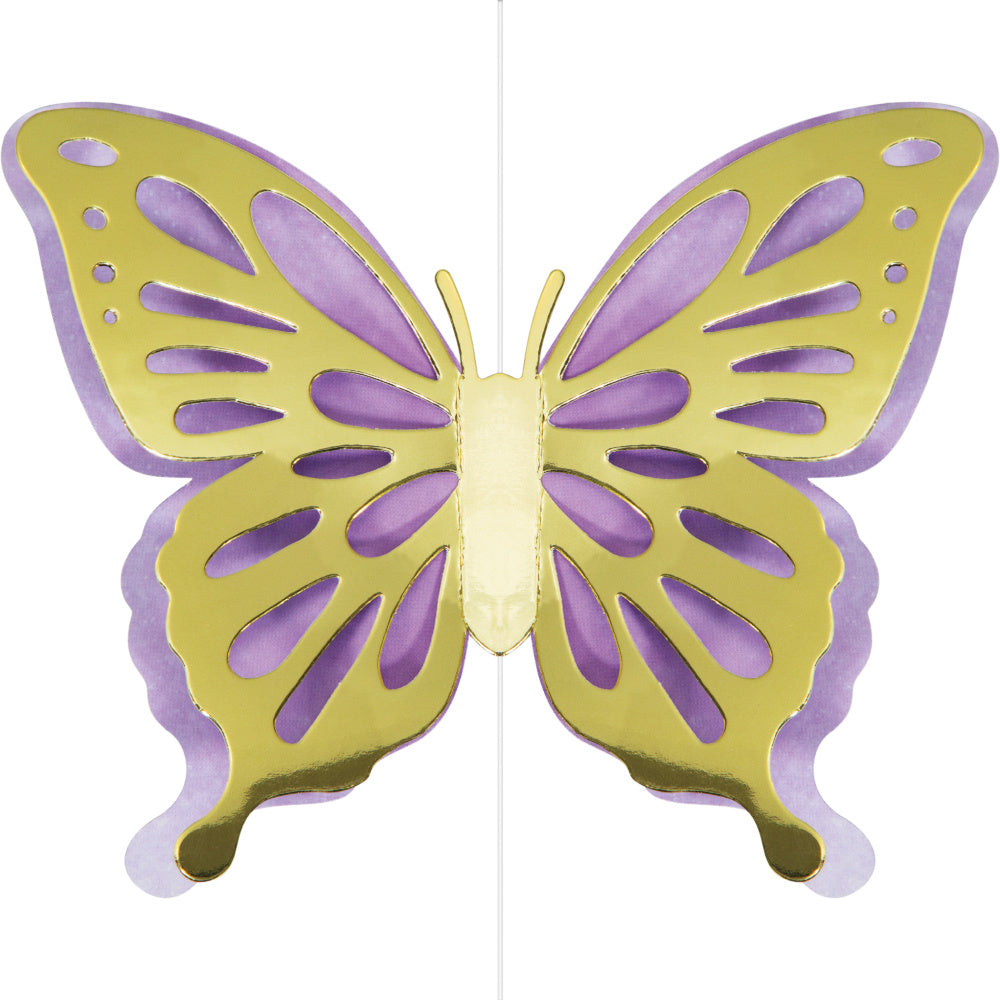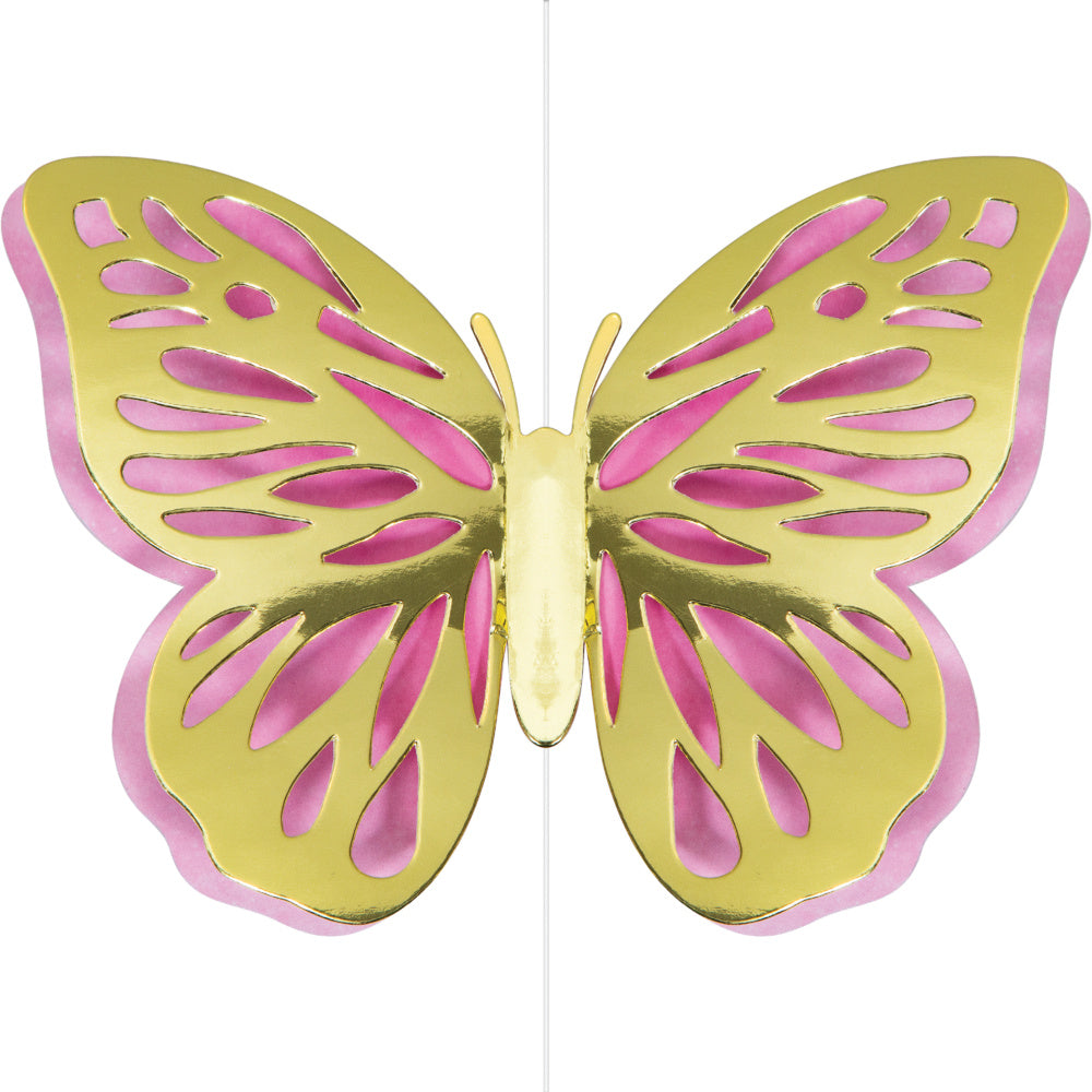 Breng elke feestruimte tot leven met deze fladderende Butterfly Shimmer hangende uitsparingen. Elke hangende decoratie heeft twee of drie met goudfolie gedetailleerde vlinders opgehangen aan een touwtje. Feestgooiers kunnen ze boven de taart- of cadeautafel hangen voor een mooi middelpunt van een feest.