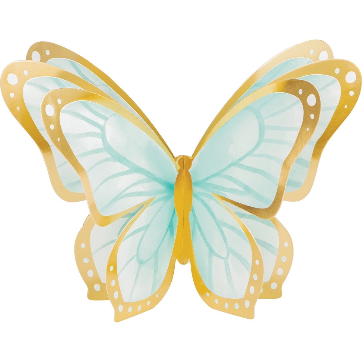 Deze driedelige middelpuntset bevat 3D-vlinders, een van 23 x 30 cm en de andere twee van 18 x 25 cm. De prachtige pastelkleurige vlinders waaieren uit om 3D te worden, zodat ze vrijstaand op de feesttafel kunnen staan. De paarse, roze en aqua-vlinders worden elk geaccentueerd door details van metallic goudfolie.