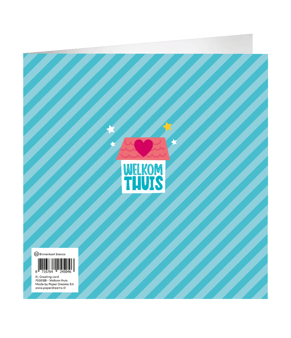 XL Greeting cards - Welkom thuis is de perfecte kaart om te versturen als er iemand na een lange tijd weer thuis komt. Niet alleen het leuke design zal opvallen bij de ontvanger, ook de grote afmeting van ongeveer 23 x 23 centimeter is gewoon niet te missen!