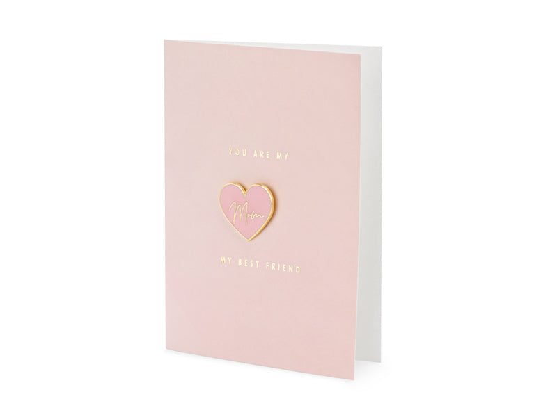 Kaart in roze kleur met goud-metallic opdruk met ge‘mailleerde speld in de vorm van een hart met inscriptie Mam en roze envelop met goud-metallic opdruk, formaat kaart ca. 10,5 x 14,8 cm, formaat ge‘mailleerde speld ca. 3 x 2,7 cm.