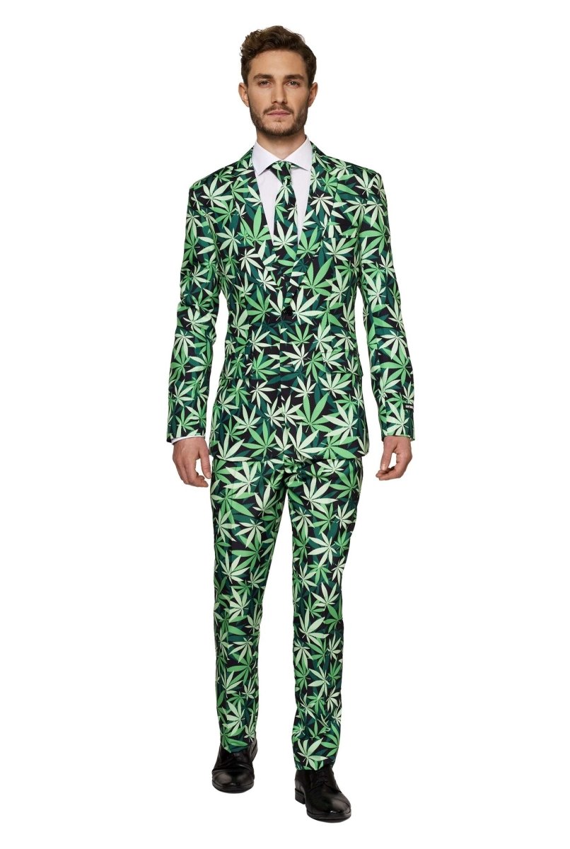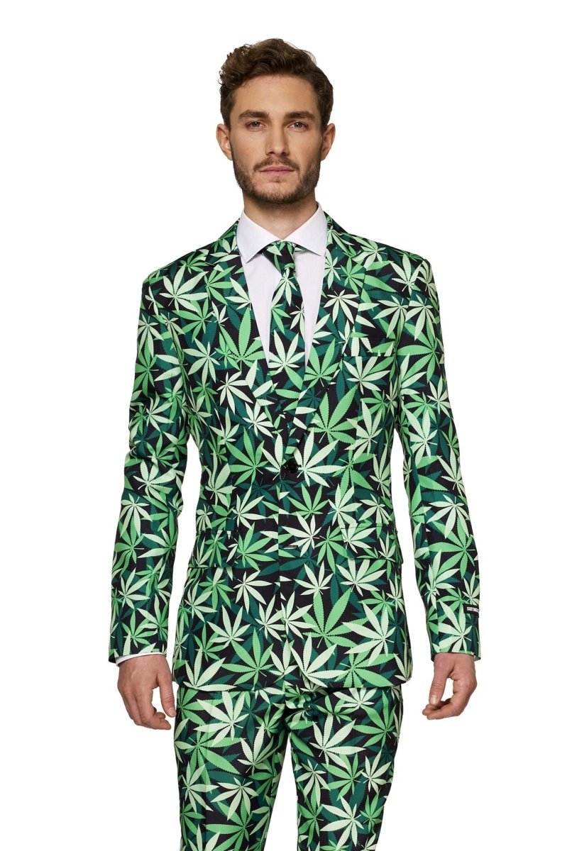 Wil je eens iets anders dragen? Dit cannabispak is een opvallende verschijning, gemaakt voor degene die 4/20 in de wolken willen leven. De slim fit outfit bestaat uit een blazer, broek en stropdas. De broek heeft een verstelbare tailleband voor een perfecte pasvorm.
