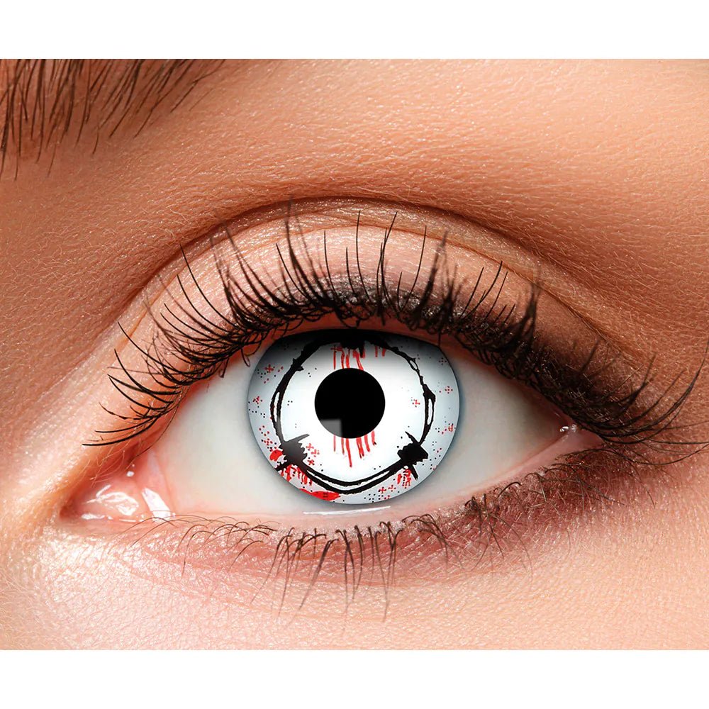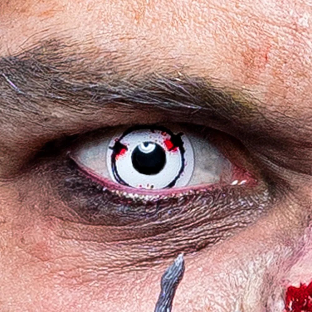 Ga je met Halloween verkleedt als gevangene? Vergeet dan ook zeker deze lenzen niet, want het maakt de look van escaped from hell echt helemaal af. De witte lenzen hebben een print van prikkeldraad en bloedvlekken, dus perfect voor Halloween. Het zijn zachte contactlenzen zonder sterkte.