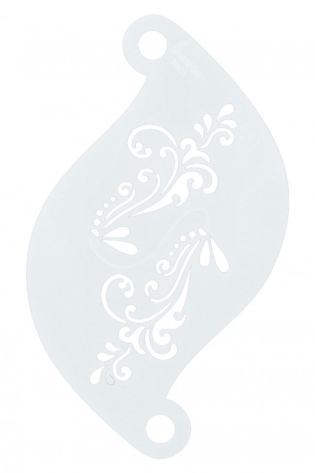 Het schminksjabloon meet 11,5 x 7 cm en heeft een elegante wing-vorm, perfect voor gedetailleerde en expressieve ontwerpen. Dankzij de perforatiegaatjes kun je meerdere stencils eenvoudig met een ringetje aan elkaar bevestigen, waardoor je een handige waaier van al je favoriete designs kunt samenstellen.