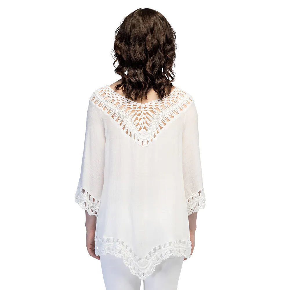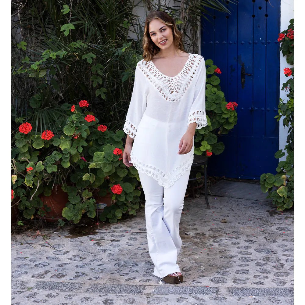 Deze mooie witte tuniek met subtiele gehaakte details is perfect voor een stijlvolle zomerlook. De gehaakte accenten aan de hals, mouwen en onderkant geven de tuniek een elegante boho touch. Dankzij de comfortabele pasvorm en de standaardmaat is deze tuniek ideaal voor een zonnige dag in de stad, een strandfeest of een festival.