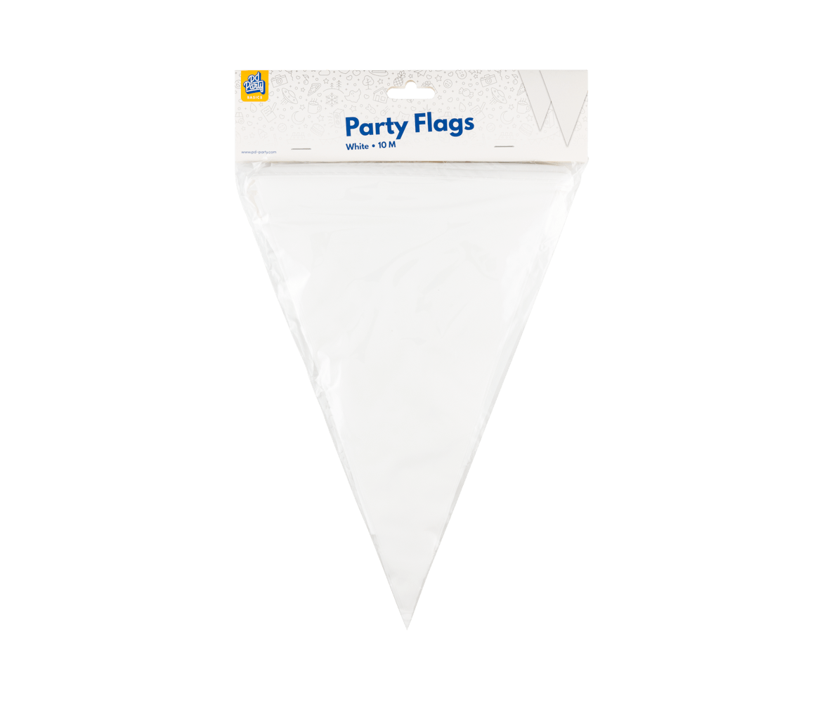 Met de party flags PE - white uit de Basic collectie van Paper Dreams haal je een kwalitatieve witte vlaggenlijn in huis voor een scherpe prijs. De vlaggenlijn is 10 meter lang en de besteleenheid is 6. De vlaggetjes zijn gemaakt van Polyetheen (PE) en zijn gemakkelijk op te hangen.