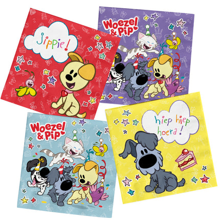 Allemaal schone snoetjes. Servetten, Woezel en Pip, 33 x 33 cm, 20 stuks. Inhoud: 20 servetten. Bijvoorbeeld te gebruiken tijdens de volgende feestgelegenheid/feestgelegenheden: Verjaardag, Kinderfeestje. De servetten zijn bedruk met Woezel die zegt: 'hiep hiep hoera' en Pip die zegt: 'jippie!'. Al hun vriendjes staan er ook op. Het wordt dus één groot vriendenfeest! Dit arikel is gemaakt van papier.