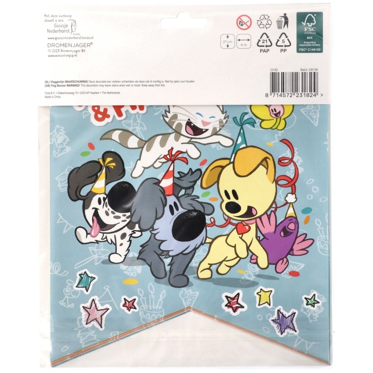 Wat een leuk vriendenfeestje! Vlaggenlijn, Woezel en Pip, 4 meter. Inhoud: 1 vlaggenlijn. Bijvoorbeeld te gebruiken tijdens de volgende feestgelegenheid/feestgelegenheden: Verjaardag, Kinderfeestje. Een vrolijke en feestelijke vlaggenlijn met 8 dubbelzijdig bedrukte vlaggen. De vlaggen zijn gemaakt van papier, de lijn is gemaakt van wit lint. Dit arikel is gemaakt van FSC papier.