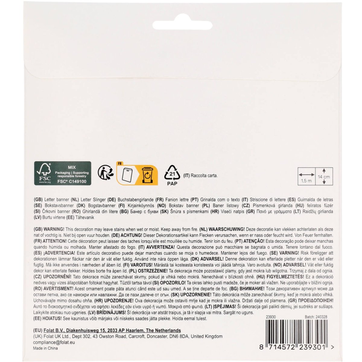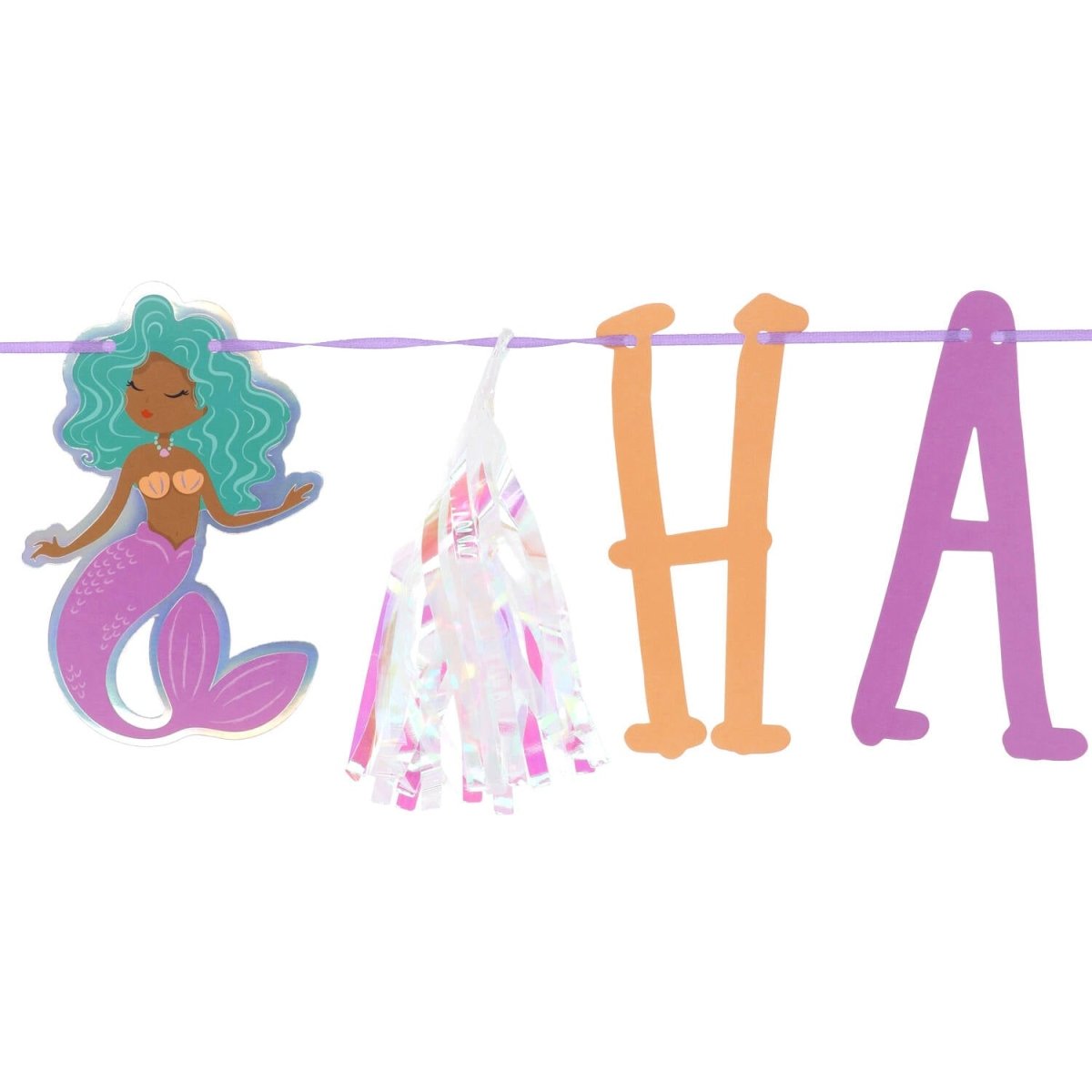 Voor elke jarige zeemeermin! Letterslinger Set - Mermaid Magic - 1,5 meter. Inhoud: 1 letterslinger uit 2 delen. Bijvoorbeeld te gebruiken tijdens de volgende feestgelegenheid/feestgelegenheden: Kinderfeestje, Verjaardag. Nu wordt het ècht magisch! Deze slinger bestaat uit twee delen: een slinger met de tekst "HAPPY BIRTHDAY" (letters zijn ongeveer 14 cm hoog) met aan weerszijden een zeemeermin en een iriserend folie kwastje, tussen de twee woorden zit ook nog een zeemeermin. Aan de tweeder slinger hangt de tekst "MERMAID MAGIC" (letters zijn ongeveer 14 cm hoog) met aan weerszijden een iriserende schelp en een iriserend folie kwastje. Dankzij de gebruikte hotstamping techniek glinsteren de iriserende schelpen echt! De letters en schelpen zijn dubbelzijdig bedrukt. Alle onderdelen kunnen heen en weer worden geschoven over het paarse lint. De linten van beide slingers zijn 2,5 meter lang.Deze vlaggenlijn hoort bij de Mermaid Magic collectie van Folat. Dit artikel is gemaakt van papier.
