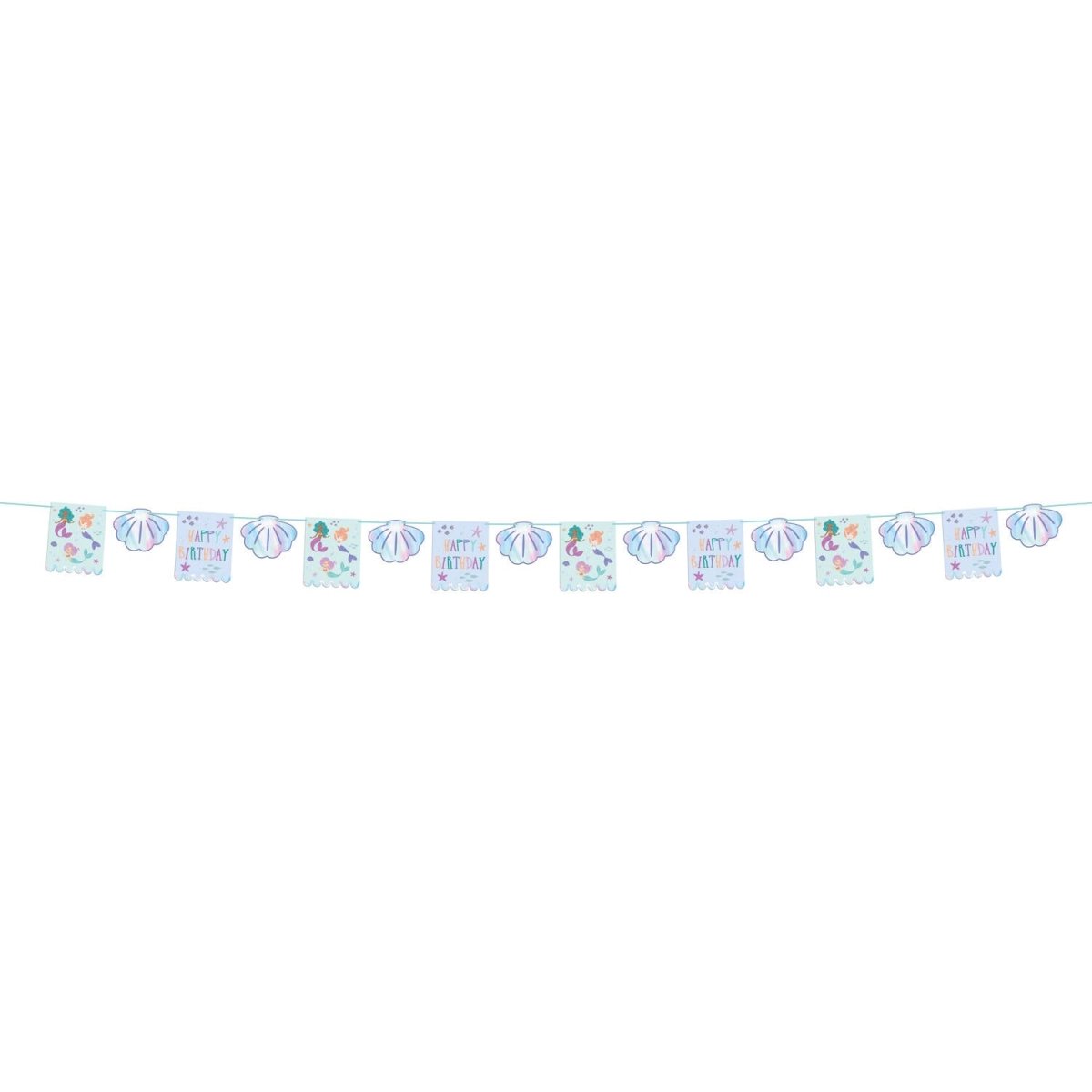 Een glinsterende onderwaterwereld. Vlaggenlijn - Mermaid Magic - 6 meter. Inhoud: 1 vlaggenlijn. Bijvoorbeeld te gebruiken tijdens de volgende feestgelegenheid/feestgelegenheden: Kinderfeestje, Verjaardag. Deze vlaggenlijn maakt er een echt zeemeerminnenfeest van. Er zitten 16 vlaggen van ongeveer 17 x 21 cm groot op deze 6 meter lange vlaggenlijn. Er zijn 3 soorten vlaggen: een mintgroene met daarop 3 zeemeerminnen en een iriserende schulprand, een paar/blauwe met daarop de tekst "HAPPY BIRTHDAY" en een iriserende schulprand en een volledig iriserende vlag in de vorm van een schelp voor die extra onderwater-schittering. Dankzij de gebruikte hotstamping techniek glinsteren de iriserende onderdelen echt! De vlaggen zijn dubbelzijdig bedrukt. Ze kunnen heen en weer worden geschoven over het turquoise kleurige lint. Deze vlaggenlijn hoort bij de Mermaid Magic collectie van Folat. Dit artikel is gemaakt van papier.