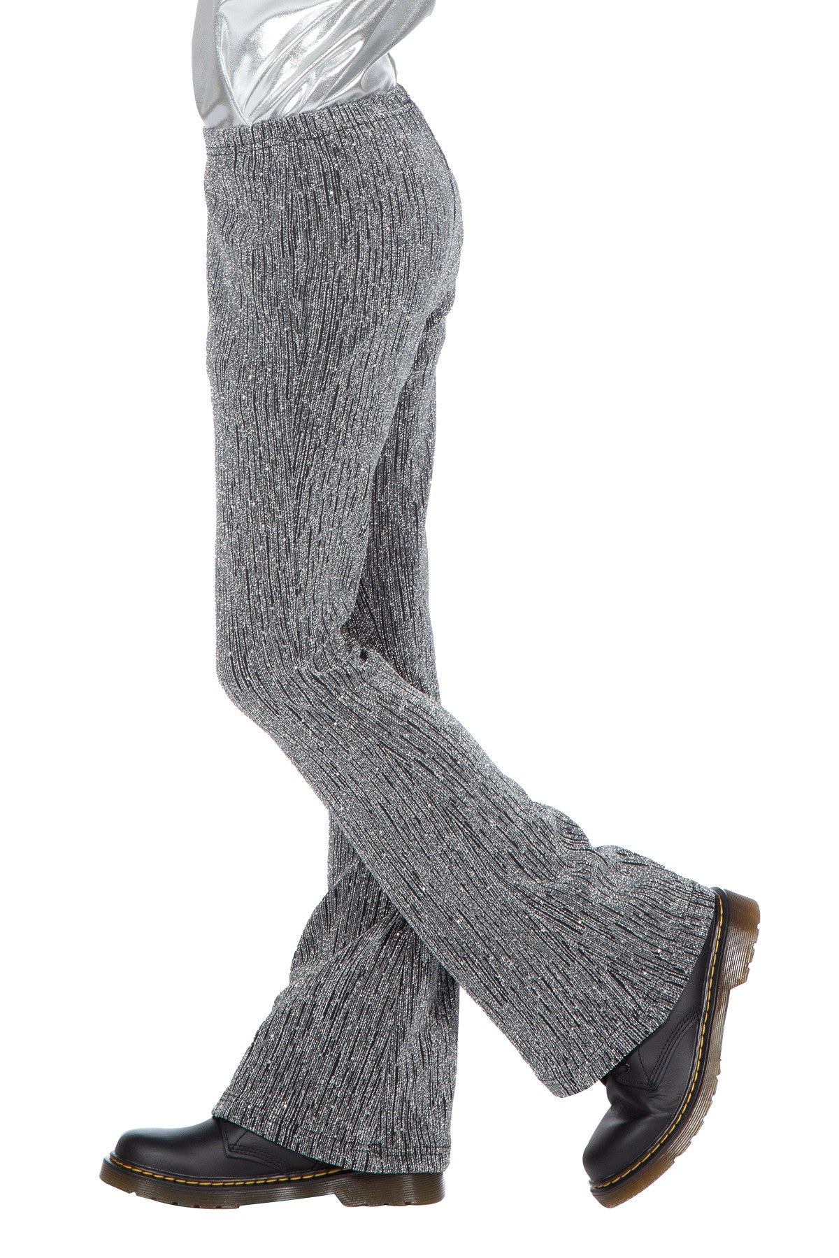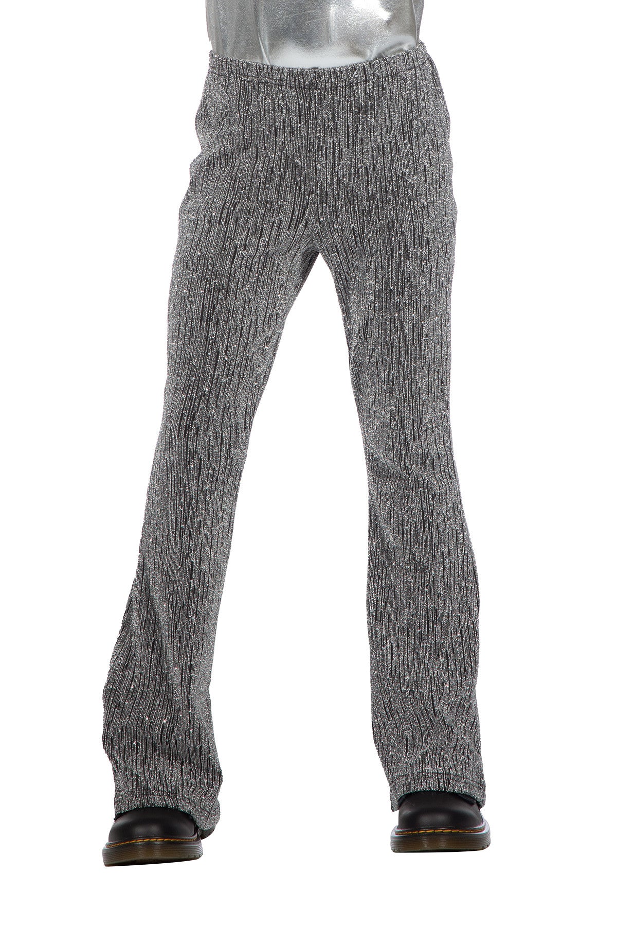 Maak elke outfit feestelijk met deze zilveren glitter flared broek. Ideaal voor themafeesten, carnaval of een glamoureuze partylook.