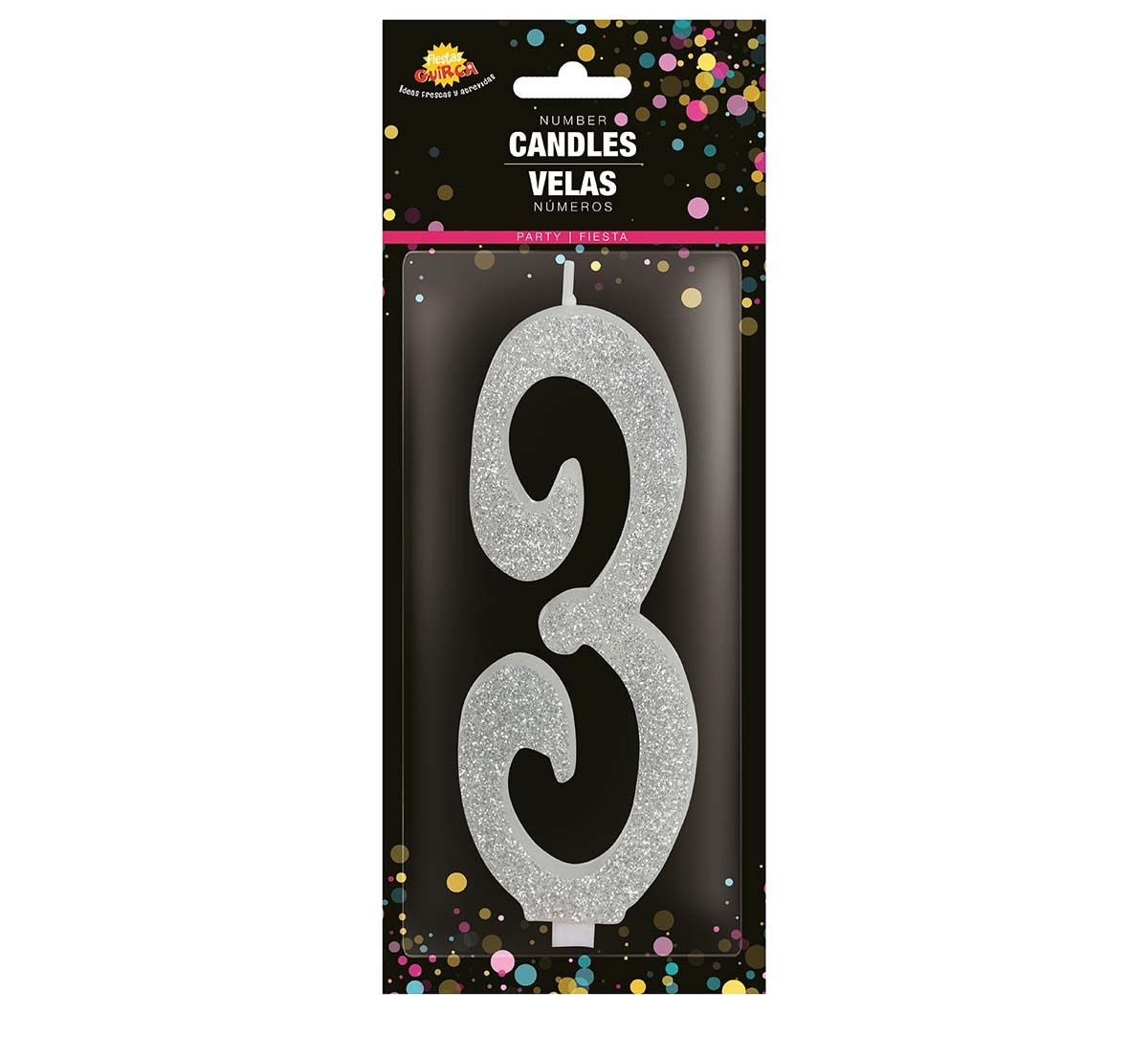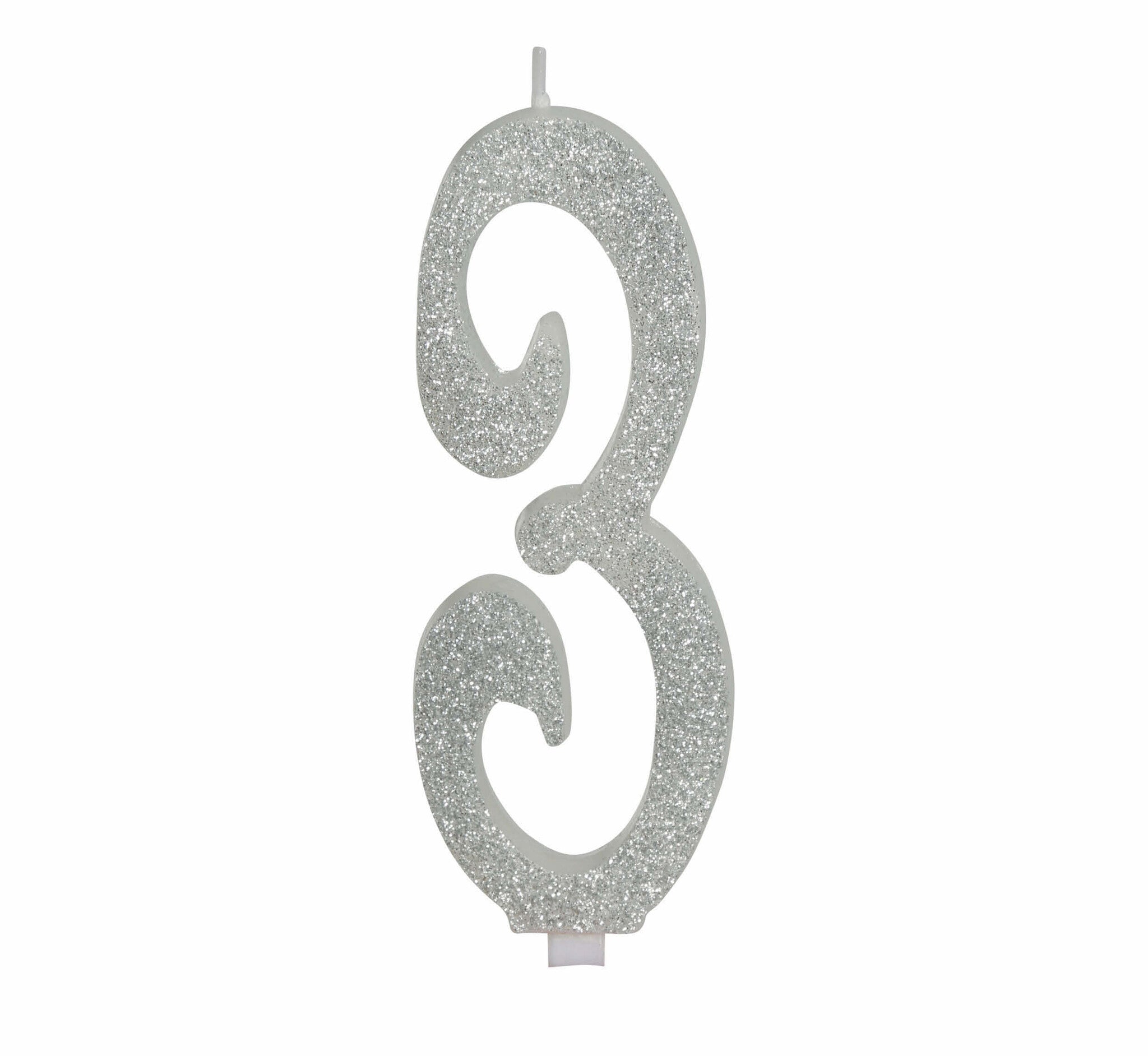Zilveren Kaars 3 Jaar Glitter 12,5cm