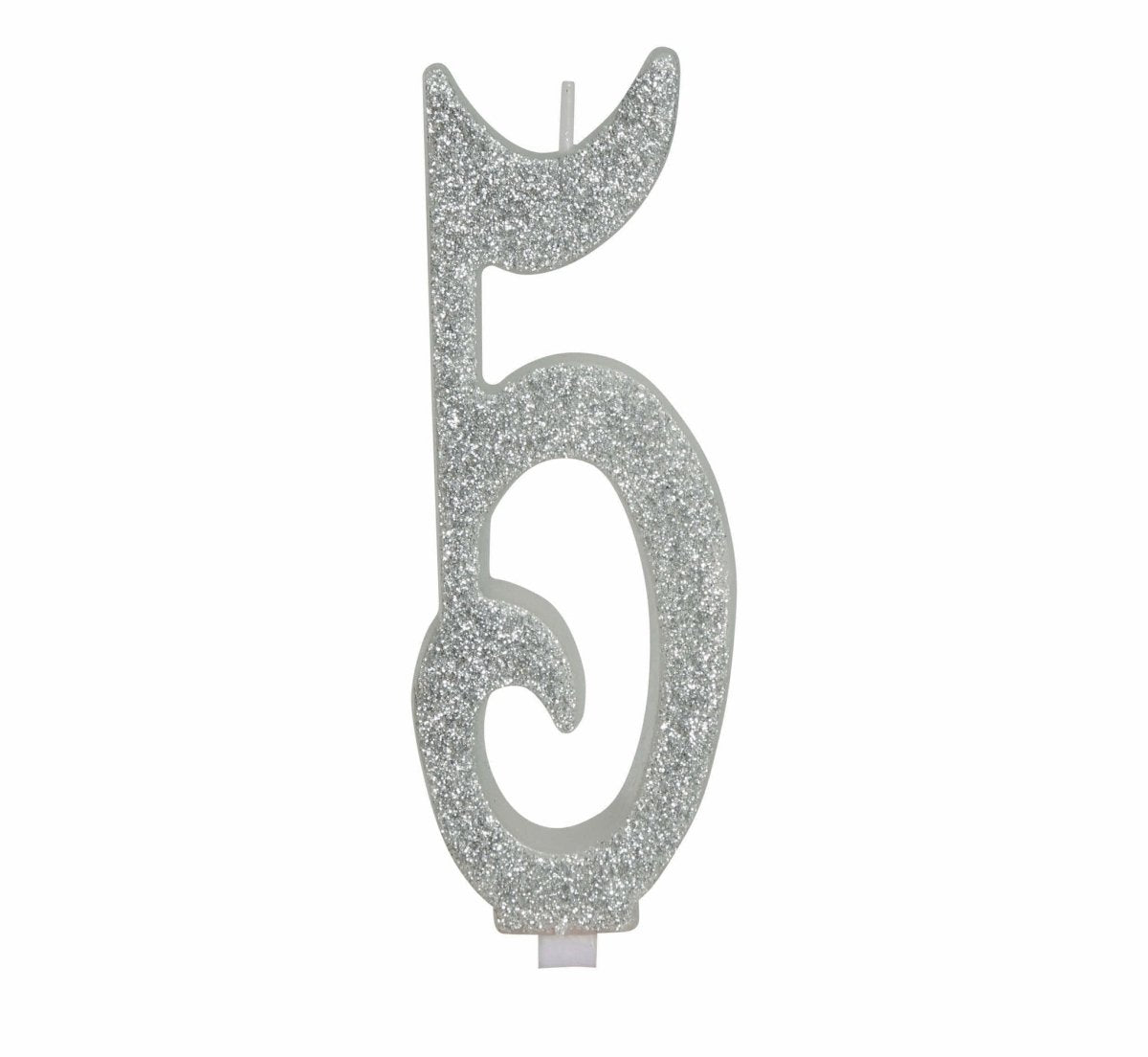 Zilveren Kaars 5 Jaar Glitter 12,5cm