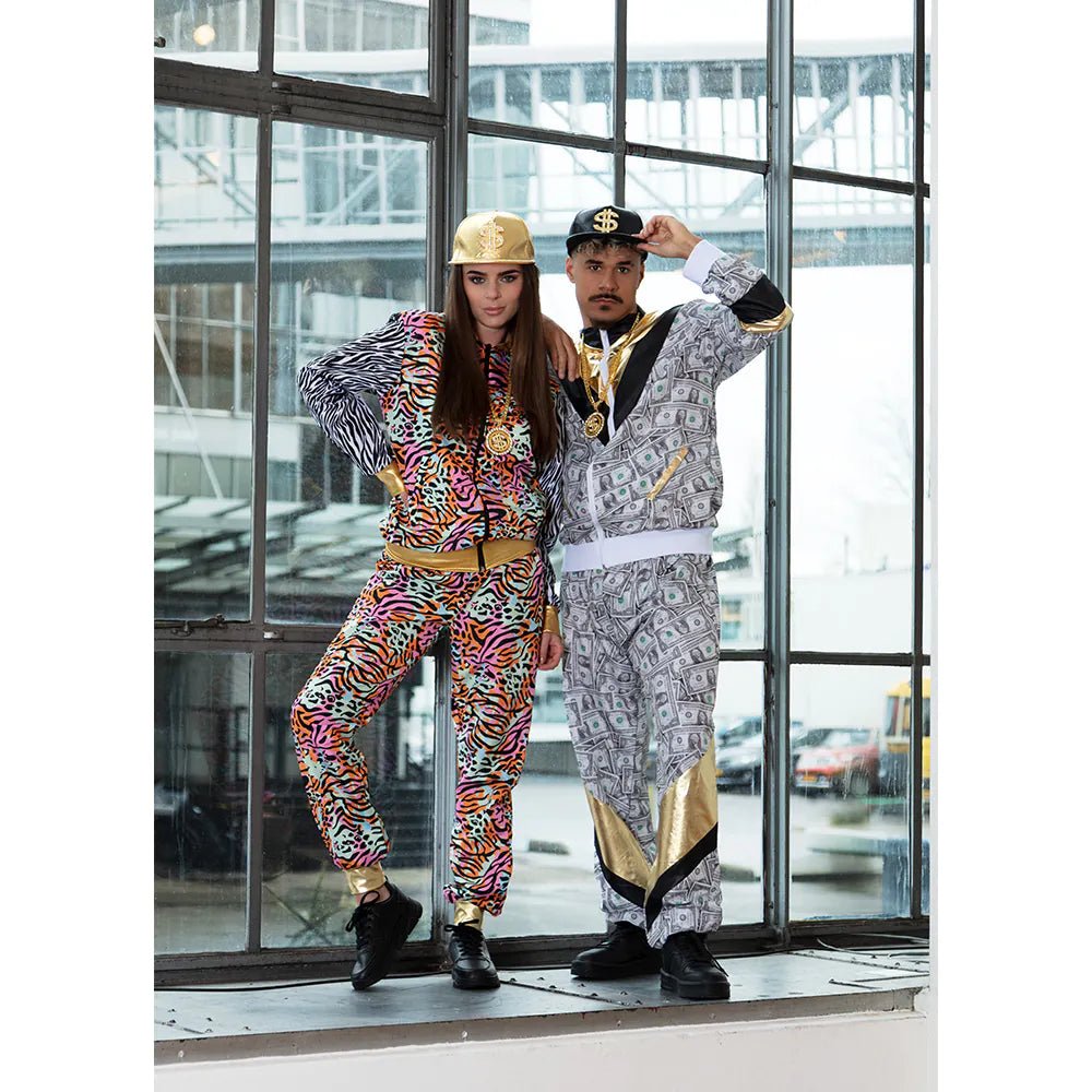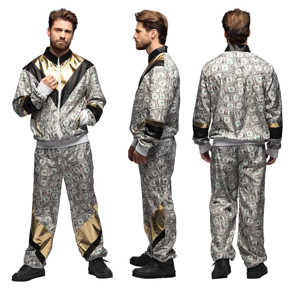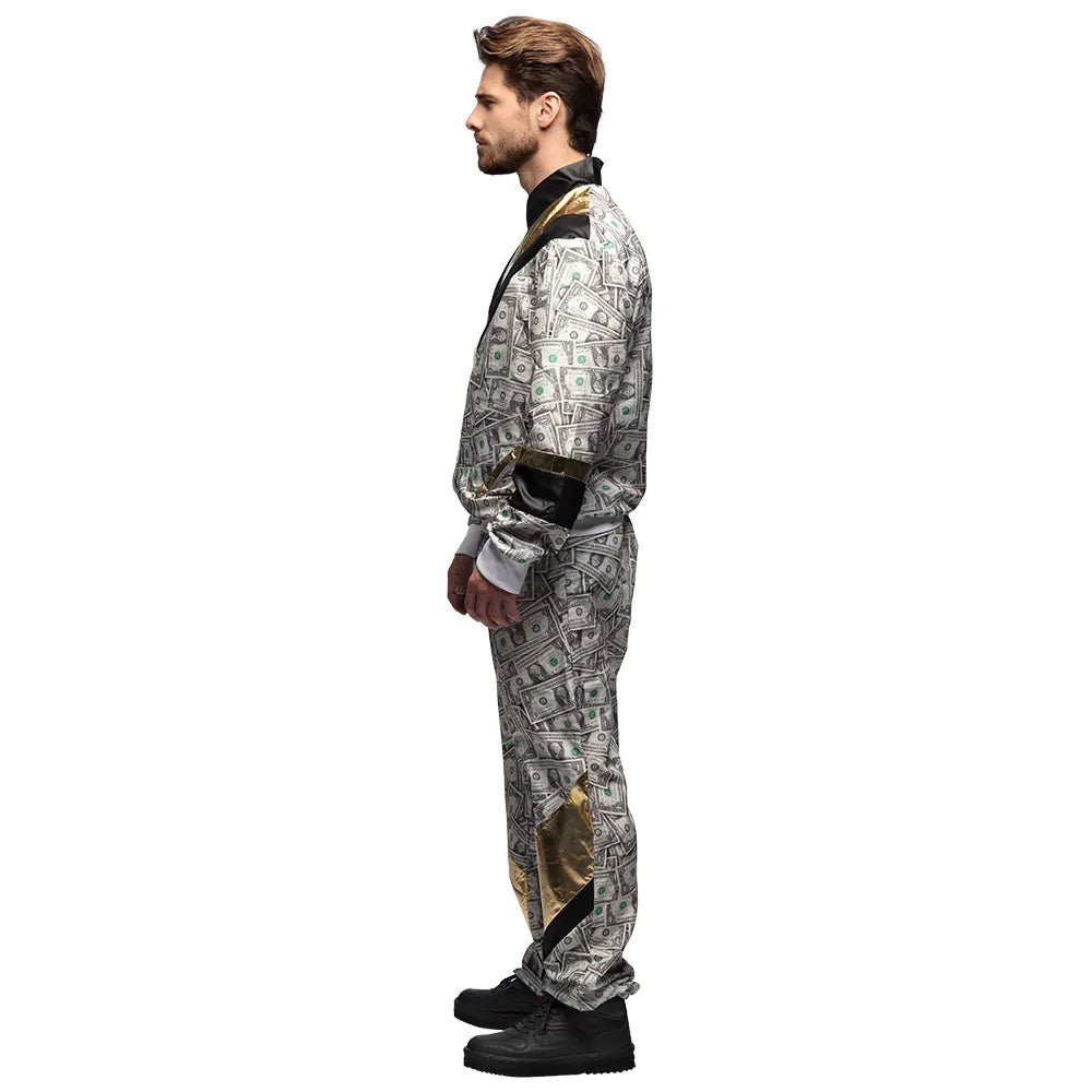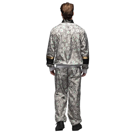 Of het nu bedoelt is als pimp outfit of als foute 90’s outfit, dit US Dollar Dude trainingspak is de perfect keuze. Het gedurfde dollarbiljettenprint en de gouden accenten maken deze Shell suit een echte eye-catcher voor Carnaval of een retro themafeest. Het foute kostuum voor mannen bestaat uit een matching jasje en broek en heeft handige zakken waaron bijvoorbeeld sleutels of een telefoon opgeborgen kunnen worden.