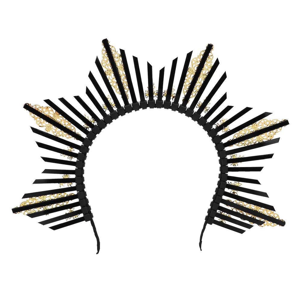 Deze zwarte halo kroon is een unieke tiara en heeft gouden versieringen en pareltjes. Deze mooie diadeem is een fantastisch accessoire om een kostuum als godin of engel compleet te maken voor carnaval of een cosplay evenement.