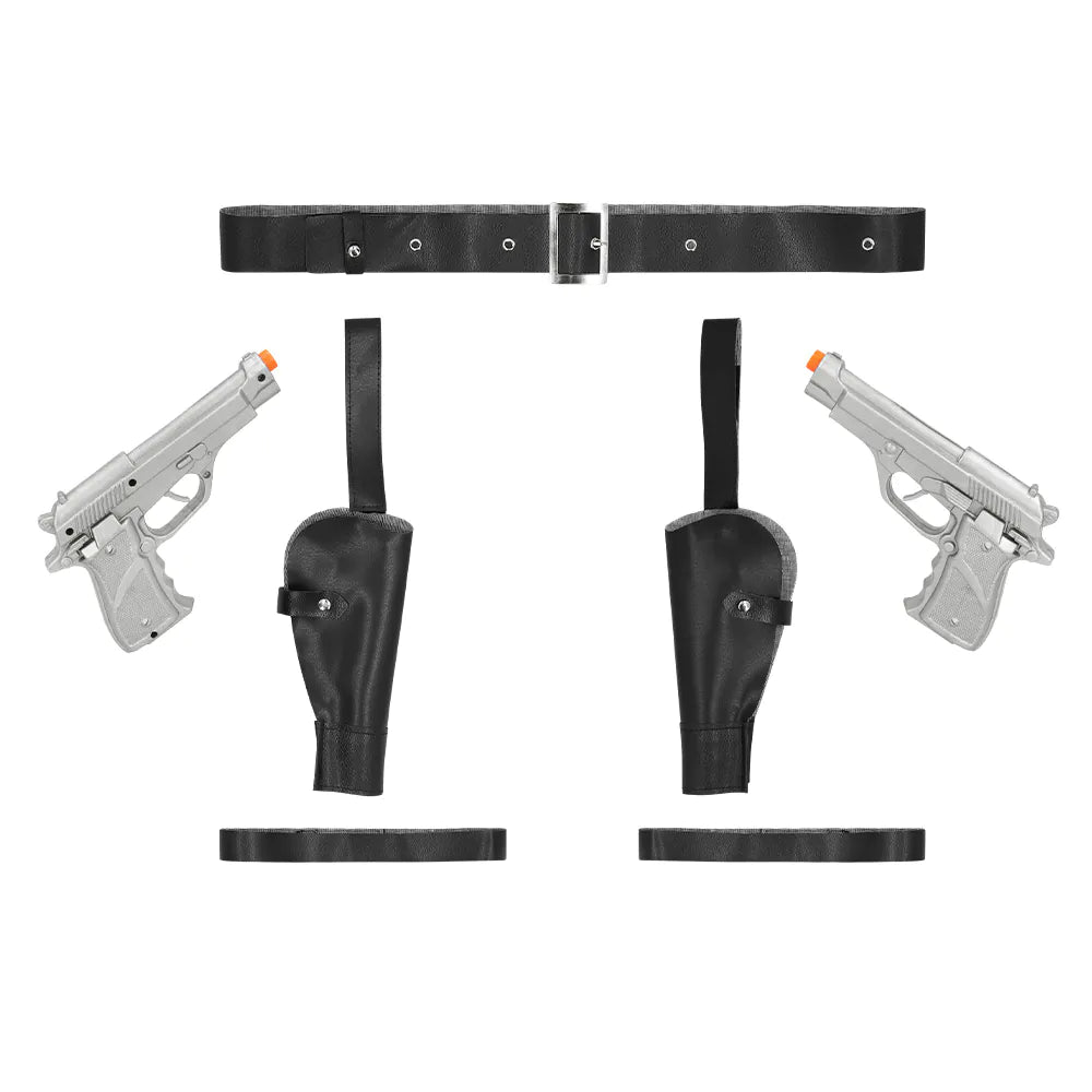 Of je nu verkleed gaat als een stoere avonturier of heldhaftige politieagent, deze complete holster set heeft alle elementen om de outfit helemaal compleet te maken. De set bestaat uit riem, beenbandjes, 2 holsters en 2 zilveren speelgoed pistolen. Perfect voor een cosplay event, een carnaval- of themafeest kostuum.