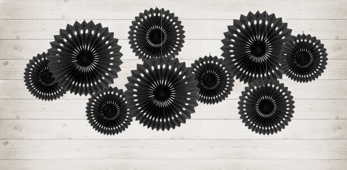 Decoratieve rozetten van tissuepapier in zwarte kleur, diameters in elkaar gezet ongeveer 20 cm, 25 cm en 30 cm. Herbruikbaar product. Montage met clip. 3 stuks.