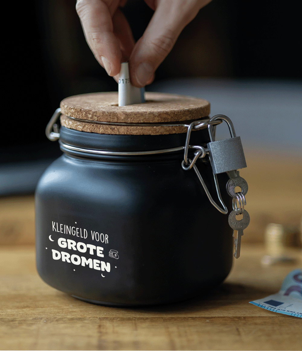De luxe spaarpotten van Paper Dreams zijn perfecte cadeaus voor bijvoorbeeld Vaderdag, Moederdag of bijvoorbeeld een verjaardag. Deze luxe spaarpot - grote dromen is gemaakt van glas en is zwart van kleur.