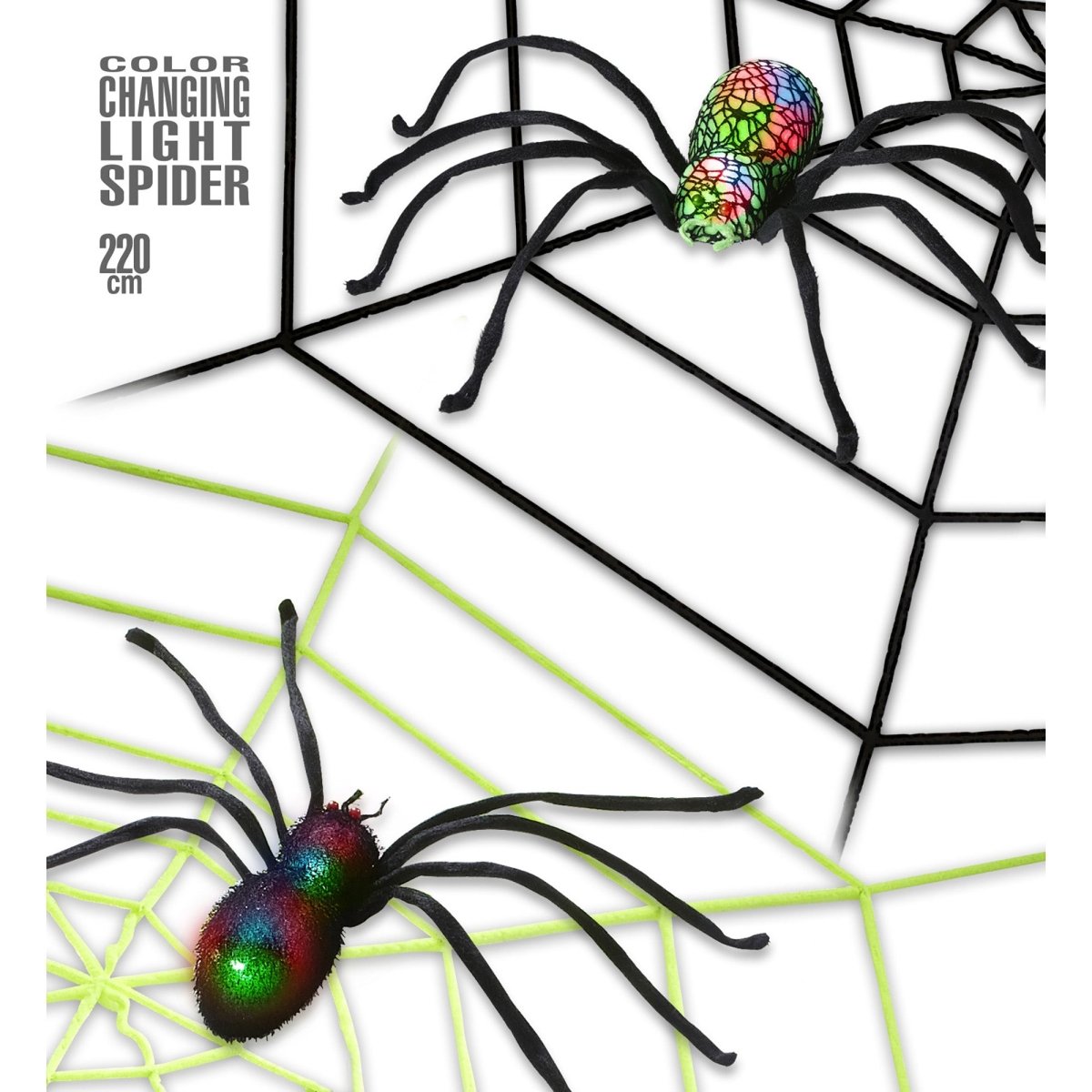 Creëer een griezelige sfeer met dit zwarte spinnenweb inclusief spin, perfect voor Halloween of themafeesten. Het web heeft een afmeting van 220 cm en is voorzien van neonverlichting die van kleur verandert, waardoor je een extra spookachtig effect krijgt.