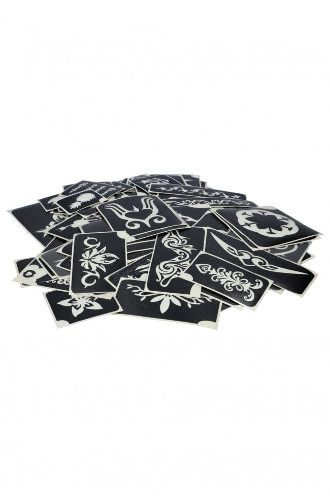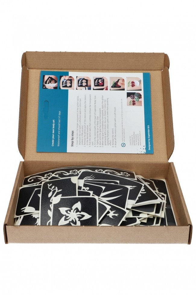 De set bevat 100 glittertattoo sjablonen. Gebruik de speciale huidlijm en fijne glitters om schitterende glittertattoos te creëren.