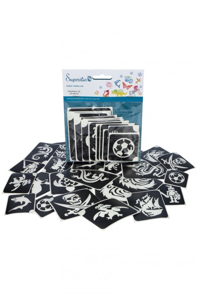 De set bevat 24 glittertattoo sjablonen. Gebruik de speciale huidlijm en fijne glitters om schitterende glittertattoos te creëren.