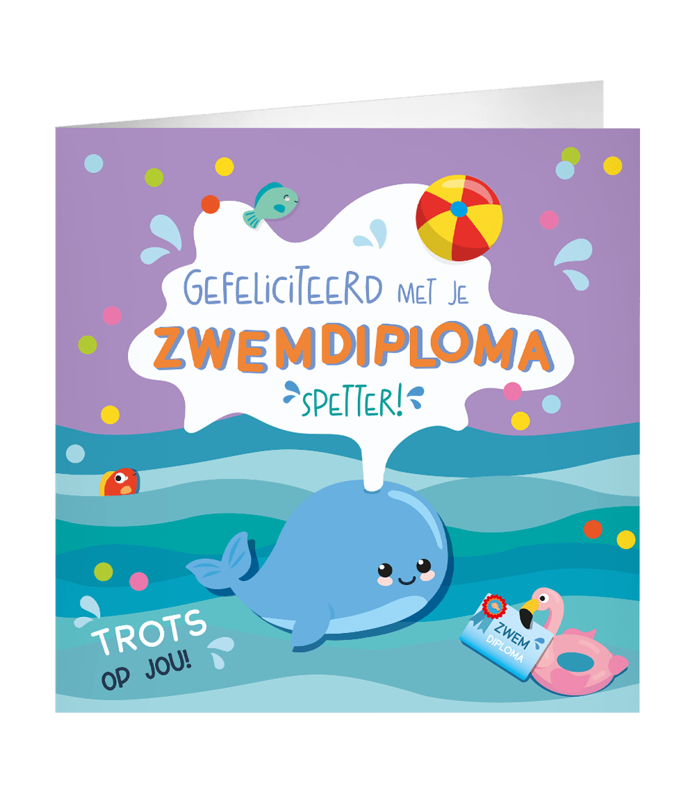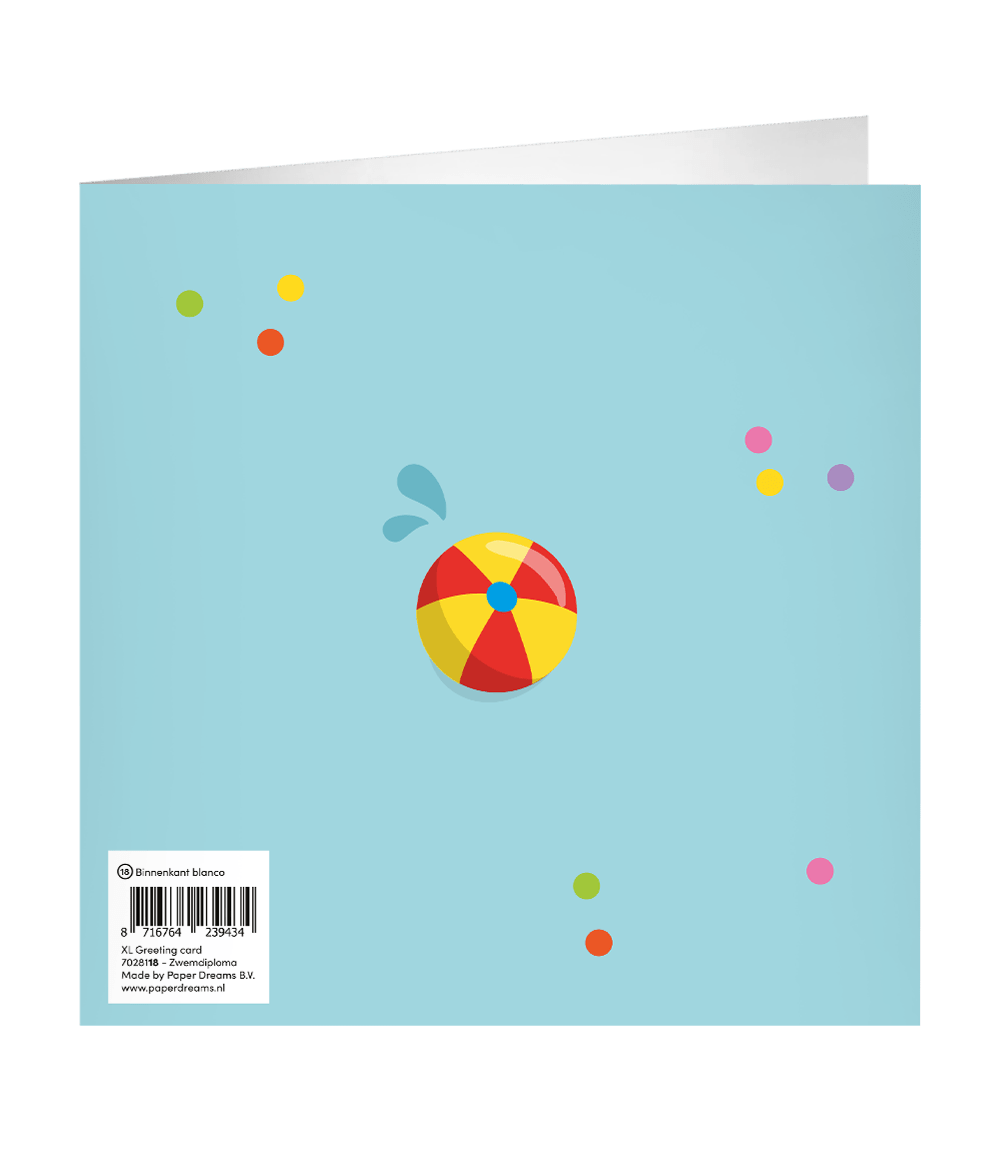 XL Greeting cards - Zwemdiploma is de perfecte kaart om te versturen als er iemand zijn of haar zwemdiploma heeft gehaald! Niet alleen het leuke design zal opvallen bij de ontvanger, ook de grote afmeting van ongeveer 23 x 23 centimeter is gewoon niet te missen!
